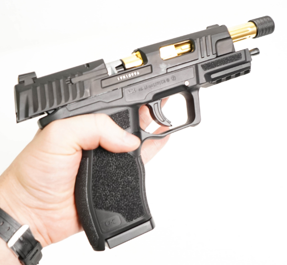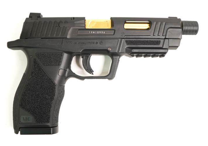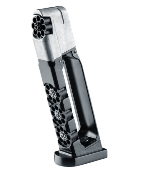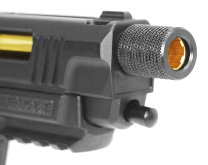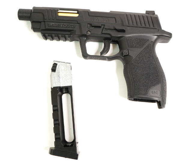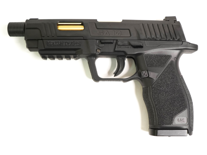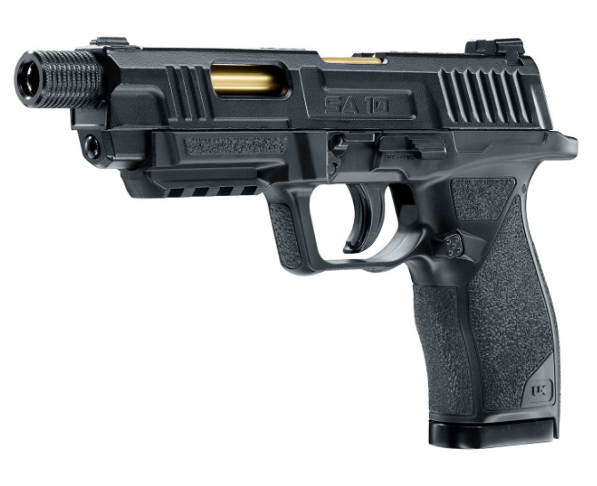 Пневматический пистолет Umarex SA10 – это модель оригинальной конструкции, выполненная в стиле кастомных матчевых пистолетов, разработка немецкого производителя. Пистолет является газобаллонной пневматикой, работающей от энергии сжатого газа и использует баллоны с углекислотой весом 12 г. Затвор при стрельбе имитуриует отдачу (система BlowBack) В качестве снарядов могут использоваться шарики ВВ 4,5 мм или свинцовые пули. Ствол изделия нарезной. Скорость вылета снарядов – 120 м/с (для шариков ВВ) и 130 м/с (для стальных боеприпасов). Один баллон с газом дает возможность произвести около 50 выстрелов. Магазин пистолета полноразмерный, с клип-барабаном из пластика емкостью 8 снарядов. УСМ Umarex SA10 двойного действия – стреляет пистолет с предвзводом и самовзводом. Затвор здесь подвижный, при выстреле происходит его выбрасывание назад, наличие такой особенности повышает реалистичность стрельбы. Ниже затвора справа расположен предохранитель-ползунок, а также замыкатель затвора для частичной разборки. Затвор пистолета имеет скелетообразную форму для снижения веса изделия. Корпус и затвор Umarex SA10 выполнены из металла, ствол из стали, корпус – из прочного пластика ABS Для Екатеринбурга: