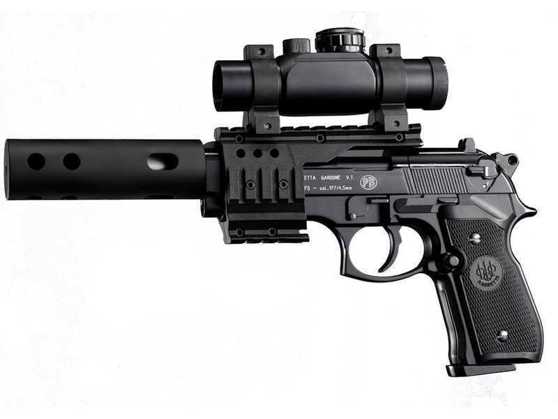 Пневматический пистолет Umarex Beretta M92 FS XX-TREME(в комплекте с коллиматором и фальш-глушителем) создан на базе Beretta 92 FS. Отличительными чертами этой модификации являются дульная насадка и коллиматорный прицел, закрепленный на монтажной базе, которая, в свою очередь, поможет вам установить любые другие оптические приспособления. Есть много причин, по которым специальные оперативные группы, армия и полиция доверяют легендарным пистолетам серии Beretta M 92 FS. Эта СО2 копия, созданная на основе боевого аналога, идеально подходит для спортивной стрельбы и тренировок. У Beretta M 92 FS Extreme невелико расстояние между спусковым крючком и задней поверхностью рукоятки, так например, в Вальтере СР88 это расстояние больше на 5-7 мм. Эта особенность может вызвать неудобство у людей с большой ладонью и длинными пальцами. В пистолете используются металлические магазины револьверного типа — барабанчики-клипы на 8 пуль. Система зарядки баллона обеспечивает быстрое приведение пистолета в боевое положение, создает оптимальное усилие пробития и поджатия баллона, повышает долговечность дозатора. Затворная рама пистолета Umarex M92 FS XX-Treme наполовину подвижная. Ударно-спусковой механизм двойного действия позволяет производить стрельбу самовзводом и с предварительным взводом курка. Усилие спуска в режиме самовзвода около 7 кг, с предварительным взводом — 2.5 кг. Корпус изготовлен из силумина. Для Екатеринбурга: