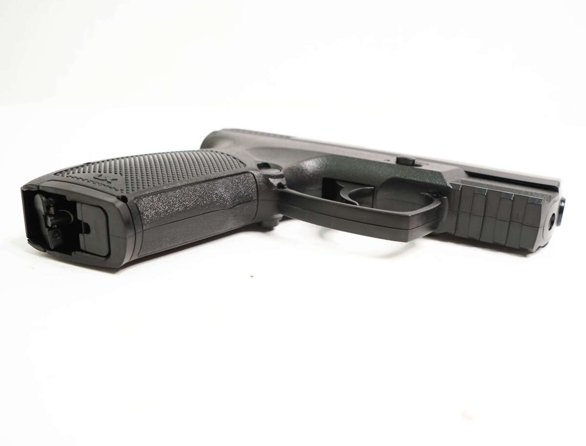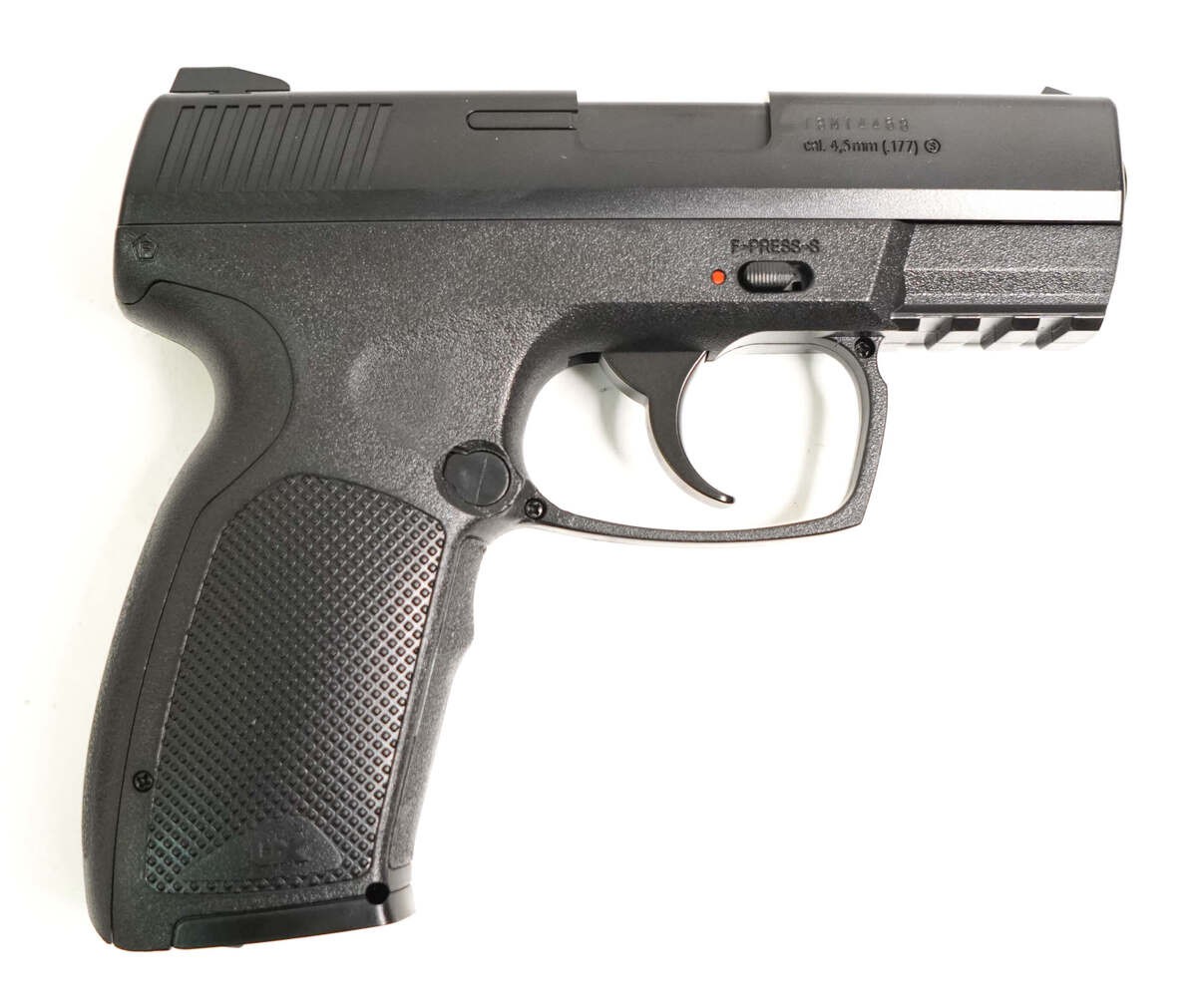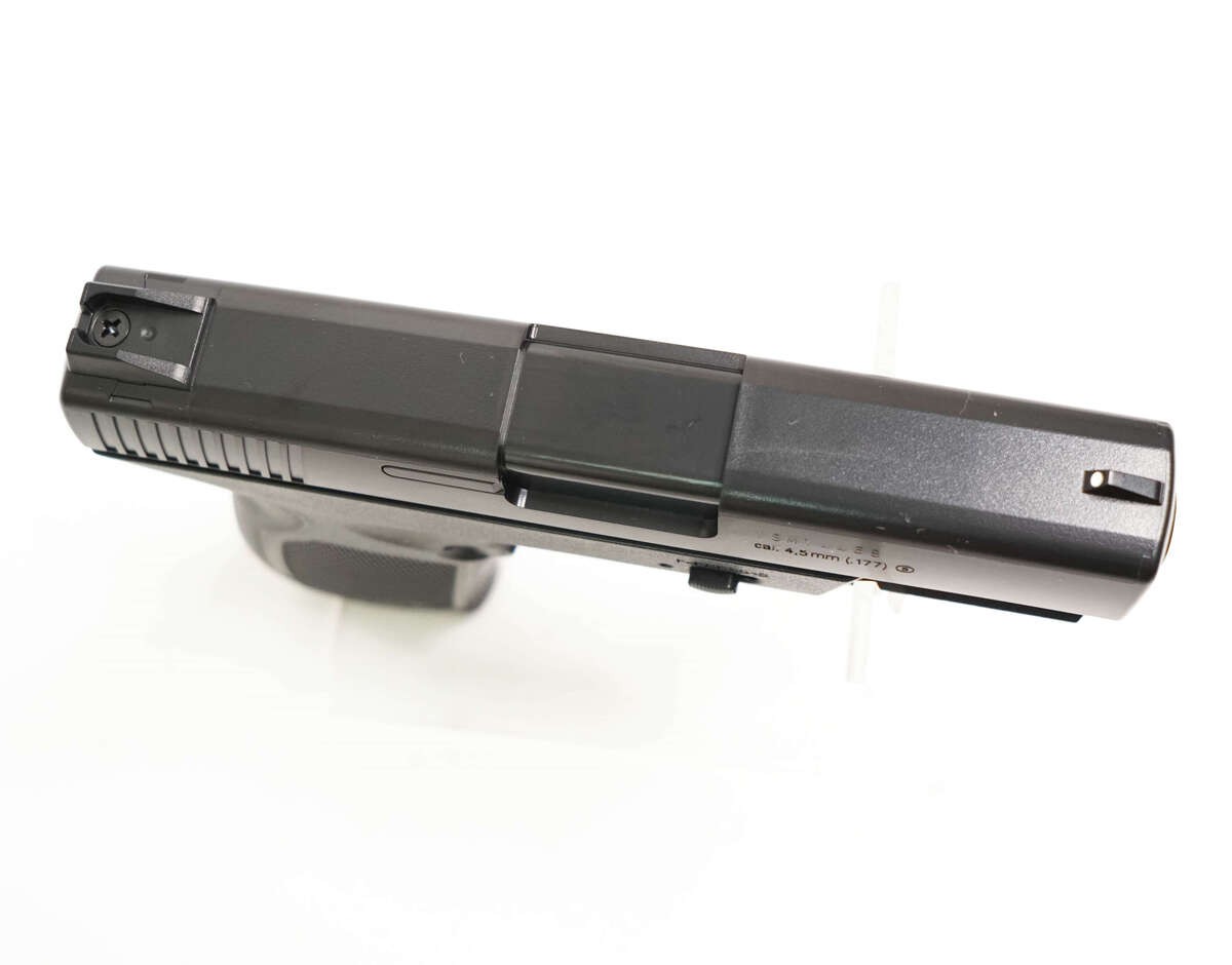 Пневматический пистолет Umarex TDP 45 отличный прибор с прекрасными техническими характеристиками, произведенный одноименной компанией в Германии и обладает приемлемой стоимостью. Изделие превосходно подойдет при развлекательной стрельбе, тренировке. В данном изделии магазин выкидной объемом на 19 боеприпасов, который взаимозаменяем со многими моделями. Устройство извлекается простым нажатием кнопки, расположенной рядом со скобой слева. Стрельба производится при помощи стальных шариков ВВ с калибром 4,5 мм. Начальная скорость боеприпаса приравнивается 125 м/с. Пистолет Umarex TDP 45 снабжен кнопочно-сдвижным предохранителем, который также и неавтоматический. В качестве источника энергии используется газовый баллон СО2 по 12 гр. Отсек для баллона расположен под задней крышкой рукоятки прибора. Прицеливание производится при помощи мушки, целика. Кроме того, внизу на раме присутствует планка Пикатинни, на которую устанавливается лазерный указатель цели либо фонарь. Прибор осуществляет стрельбу посредством самовзвода, у изделия производится взвод скрытого курка. У пистолета затворная рама является не подвижной. Корпус Umarex TDP 45 черного цвета, произведен из пластика, который ударопрочен к механическим повреждениям. Изделие является компактным и весит всего 390 гр при общей длине - 173 мм. Ствол гладкий, длиной - 10,8 мм. Данный прибор с легкостью и удобством держится в руках. Для его приобретения нет необходимости в разрешении по той причине, что он обладает невысокой энергией - меньше 3 Дж. Изделие считается легким вариантом для меткого попадания в мишень, также его выбирают за качество, компактные размеры.