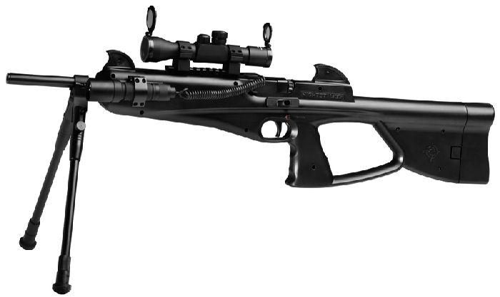 Первая полуавтоматическая пневматическая винтовка с системой "blowback" : при каждом выстреле затвор проворачивает барабан и взводит спусковой механизм для следующего выстрела). Это обеспечивает мягкий спуск и высокий темп стрельбы. В комплекте с винтовкой поставляются: баллон СО2 88 гр, фонарь тактический, коллиматорный прицел, сошка. Для Екатеринбурга: