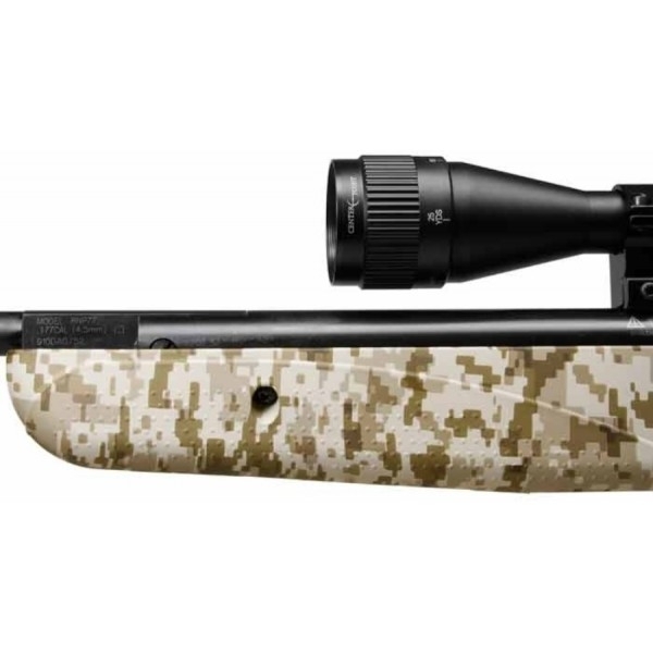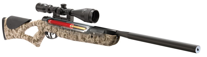 В комплекте с винтовкой идет прицел CenterPoint 3-9x40 AO (Mildot, планка Weaver) Начальная скорость пули составляет 305 м/с (суперлегкой пулей - 365 м/с). В оружии используется современная технология Crosman - заполненный азотом пневмоцилиндр, который играет роль газовой пружины. Благодаря этому винтовка действительно стала "всепогодной", т.к. азот стабильно сохраняет свои свойства при различных температурах и атмосферных давлениях. Благодаря использованию нитроузла вместо обычной пружины, а также наличию встроенного модератора(глушителя) винтовка стреляет практически бесшумно (по данным компании Crosman шум при выстреле снижается на 70 процентов). Кроме того, заметно меньше отдача при выстреле, чем на обычной пружинно-поршневой пневматике. Это увеличивает срок службы всех механизмов оружия и особенно оптического прицела. Винтовку можно долго держать во взведенном состоянии, не боясь, что пружина "сядет". Это было серьезным минусом обычных пружинно-поршневых винтовок. Утолщенный ствол способствует снижению вибраций при выстреле, что также повышает точность стрельбы. Винтовка оснащена эргономичным прикладом, отвечающим современным требованиям.