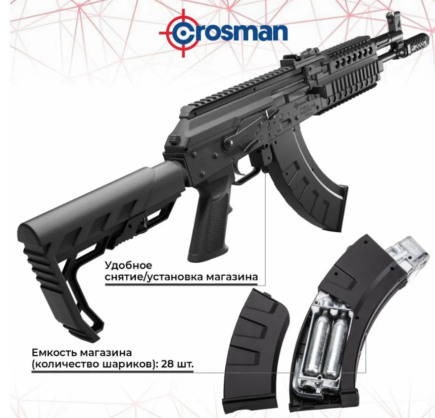 Пневматический Калашников Crosman AK1 от известного американского бренда. Crosman - крупнейший американский производитель пневматического оружия, основанный в 1923 году. Продукция Кросман ценится своей прочностью и неприхотливостью.
