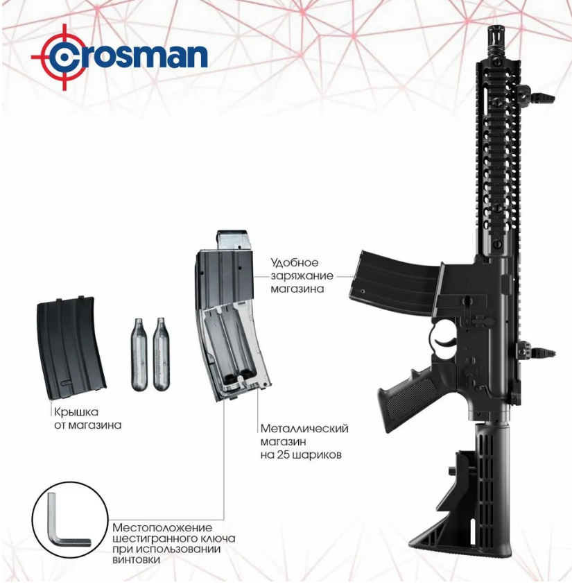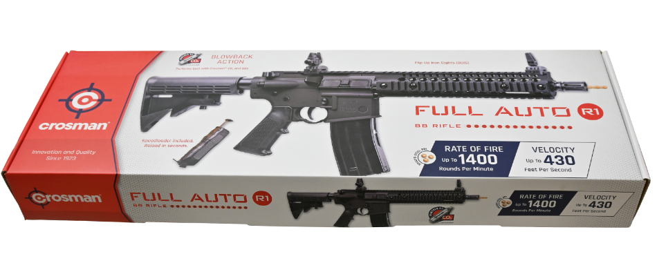 Боевым прототипом представленной модели является легендарный автомат AR-15. Crosman R1 относится к газобаллонной пневматике с дульной энергией до 3 Дж. Выстрел осуществляется за счет энергии сжатого углекислого газа, содержащегося в баллончиках co2. Баллончики устанавливаются в магазин винтовки при помощи шестигранного ключа.