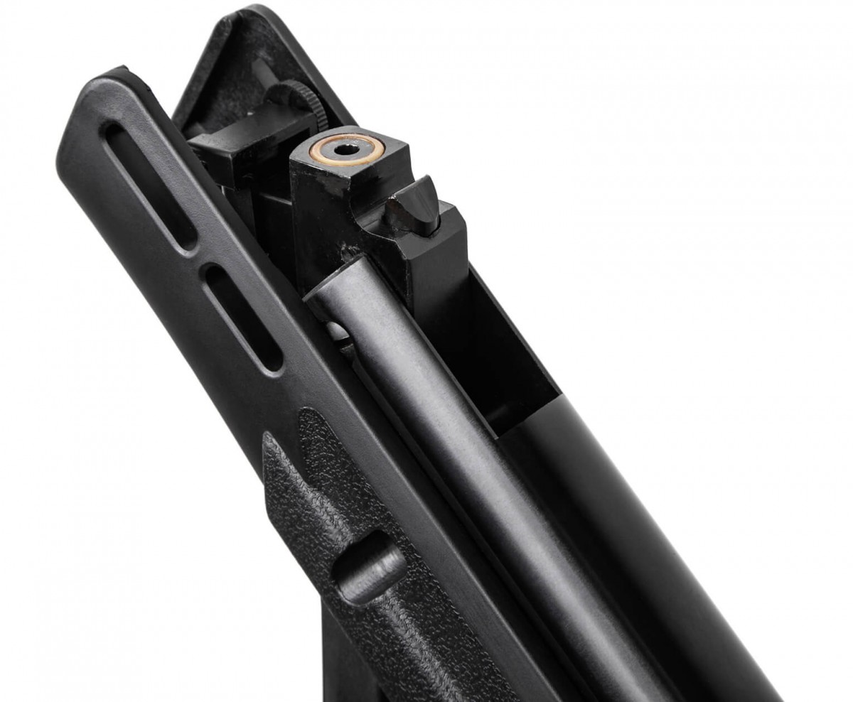 Пневматическая винтовка Crosman Diamondback - сочетание отличной мощности, великолепного дизайна и точности, даже при беглом взгляде оставляющей ощущение стремительной мощности и элегантности. Ее качество, как и других винтовок компании Crosman, безупречно, а продуманный дизайн делает эту винтовку исключительно удобной и надежной. В комплекте с винтовкой идет газовая пружина для восстановления мощности (винтовка ослаблена под закон РФ) Относятся она к классическим переломкам. Но в пределах этого стиля она имеет исключительно современный дизайн, рассчитанный на максимальное удобство использования. Ствол нарезной, под стрельбу легкими пульками 4,5 мм, которые разгоняются до скорости 350 м/с. Это превращает ее в серьезное оружие, которое подходит для охоты. Для уменьшения громкости звука выстрела установлен саундмодератор, имеющий оригинальную конструкцию, и эффективно срабатывающий и на уменьшение отдачи. Выстрел осуществляется за счет энергии, обеспечиваемой газовой пружиной Nitro-поршень. Которая, помимо хорошей мощности и относительно небольшой шумности, еще и имеет большое запас прочности, а также позволяет длительное время нести винтовку во взведенном состоянии, что невозможно для витой пружины. Спусковой крючок имеет достаточно умеренную длину хода. Безопасность от несанкционированного выстрела обеспечивается предохранителем, который располагается рядом с ним. Ложа исполнена в исключительно эргономичном дизайне, в котором, в пределах классического стиля, прослеживаются мотивы, напоминающая боевое оружие. Это облегчает ее вес, одновременно делая ее исключительно удобной. Рукоять пистолетная, сильно выступающая вниз, имеет удобный изгиб под ладонь и выступ под мизинец, препятствующий соскальзыванию руки. Насечки на щечках обеспечивают удобное положение руки и плотный обхват. Цевье имеет выступ, который позволяет ладони удобно упираться, и дополнительно снабжено боковыми ребрами, которые обеспечивают наиболее комфортное положение пальцев. Этому же способствует и то, что цевье слегка скошено в направлении дульного конца оружия. Приклад имеет удлиненные формы, скругленный, не образует каких-либо неудобных выступов. Снабжен затыльником оригинальной конструкции, на котором имеются выступы, улучшающие контакт с плечом. При стрельбе и прицеливания винтовка исключительно комфортно ложится в руки, обеспечивая возможность неутомительной стрельбы из любого положения. Прицельных устройств два. Открытый прицел - хорошо заметная мушка и регулируемая по горизонтали и вертикали планка. Оптика или коллиматор устанавливается на крепление «ласточкин хвост». Использование для ложи ударостойкого пластика делает винтовку легкой, комфортной при стрельбе на холоде и придает ей исключительно элегантный вид, делающий ее великолепным подарком. Для Екатеринбурга: