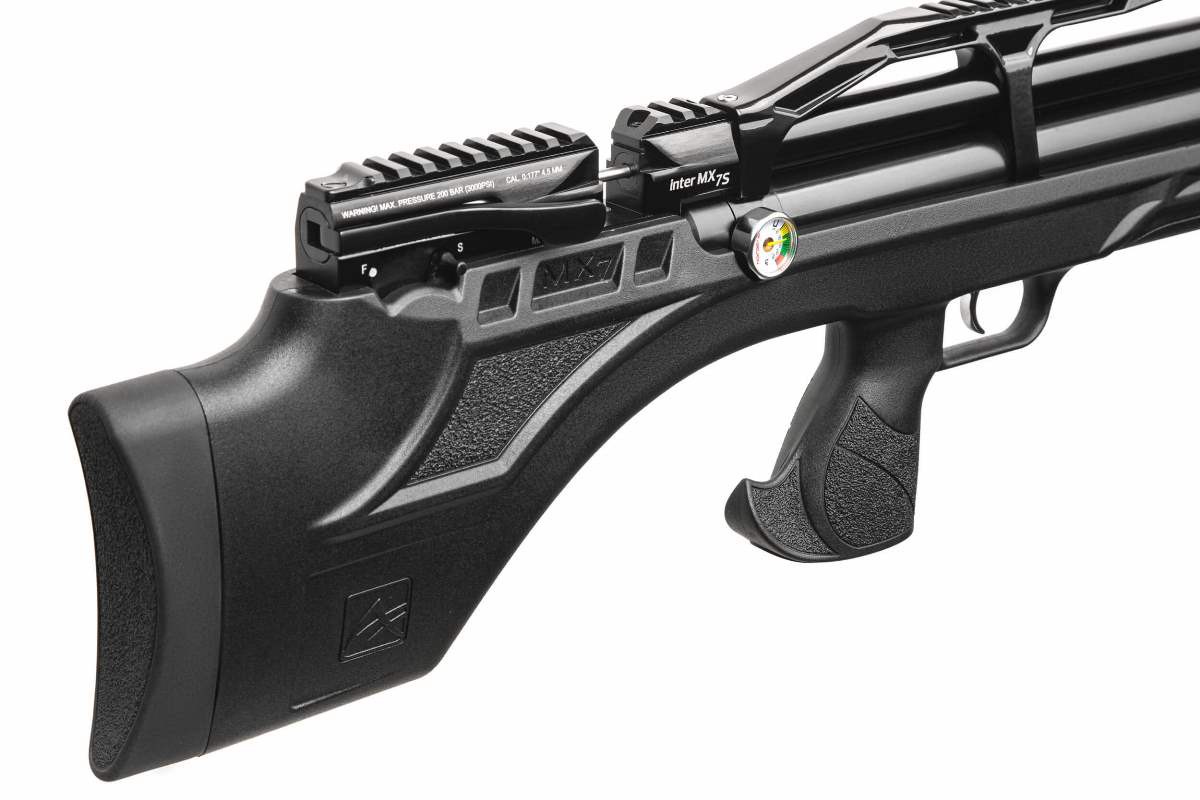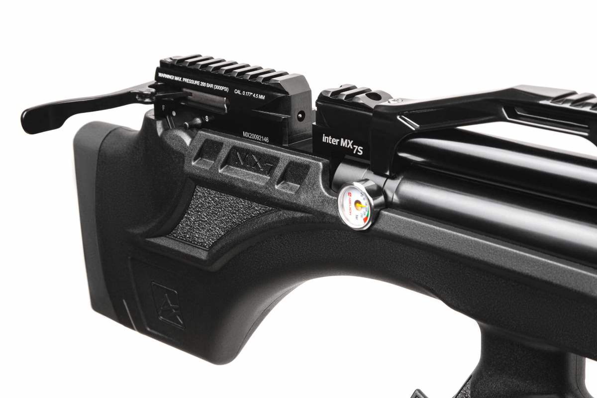 Aselkon MX 7-S - пневматичекая винтовка системы PCP производителя оружия из Турции. Источником энергии выступает резервуар высокого давления со сжатым воздухом. Для мониторинга давления установлен манометр. Стрельба ведется свинцовыми пулями калибра 5,5 мм. Магазин рассчитан на 12 зарядов. Стоит отметить, что благодаря стационарному глушителю стрельба из винтовки практически бесшумна. Корпус оружия выполнен из устойчивого полимера черного цвета. Внешние прицельные приспособления не предусмотрены, но это компенсируется наличием планки Пикаттини для установки оптики.