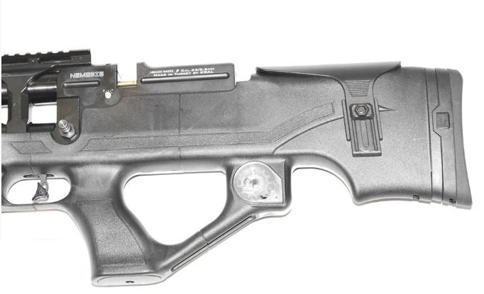 Пневматическая винтовка PCP Kral Puncher NEMESIS, булл-пап, калибр 6.35 мм Винтовка Kral Puncher Nemesis калибра 6,35мм отлично подойдет для любителей стрельбы по мишеням и охотникам. ОГРОМНЫЙ РЕЗЕРВУАР объемом 500 см3. В комплекте с винтовкой поставляются 2 магазина емкостью 10 пуль Винтовка изначально не оснащена открытыми прицельными приспособлениями, а планка Weaver четко дает понять что винтовка рассчитана на стрельбу на средние и дальние расстояние, поэтому оптимальным выбором для нее будет оптический прицел кратностью 3-9х40 По этой ссылке можно перейти на официальный сайт Kral. Комплектация: винтовка, паспорт + сертификат, пластиковый кейс, 2 магазина (барабан), заправочный штуцер, усиленный перепускной клапан, тактическая рукоять-сошка. Оптический прицел в комплект НЕ входит На резервуаре винтовки Kral Puncher Breaker NEMESIS 6,35 установлен манометр с максимальным давлением в 300 Бар. Ствол у винтовки нарезной. Приклад имеет форму булл-пап, благодаря чему длина всей винтовки всего 920 мм, а вес Kral Puncher Nemesis - пластик 3.65 кг, дерево 3.95 кг Для Екатеринбурга:
