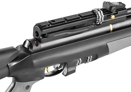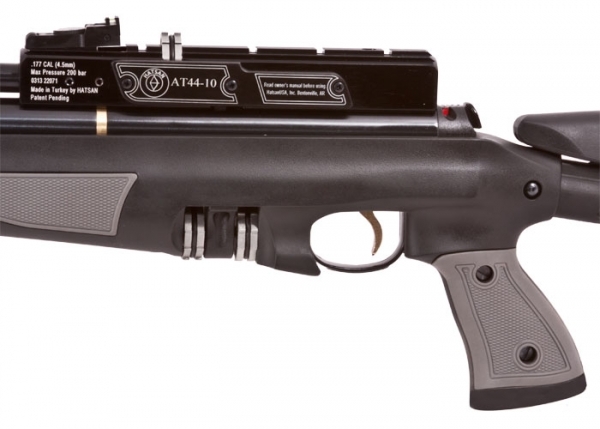 Взвод винтовки Hatsan AT44-10 TACT и перезарядка производится с помощью рычажного бокового затвора. Предохранитель срабатывает автоматически при каждой перезарядке.