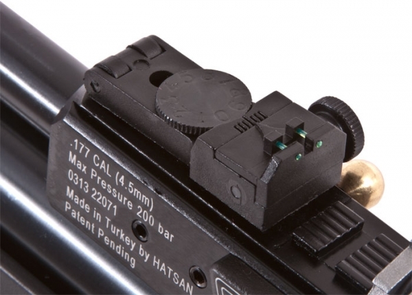 Винтовка Hatsan AT44-10 TACT оснащена открытыми прицельными приспособлениями. Мушка пластиковая с возможностью регулировки по вертикали. Прицельная планка полностью металлическая на фрезерованном основании с возможностью регулировки по вертикали и горизонтали.