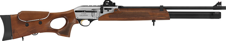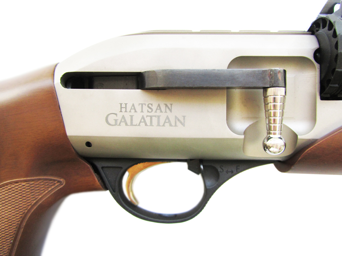 PCP винтовка Hatsan Galatian 1 получила новый элегантный дизайн, внешне очень схожий с дизайном автоматических гладкоствольных ружей. Винтовка имеет барабан на 16 пуль, выполненный из металла. Пули в барабане удерживаются двумя резиновыми кольцами, что предотвращает заряжание более чем одной пули в ствол. Для снятия барабана нужно отвести ручку взвода и сдвинуть рычажок, связанный с осью барабана. Ствол у винтовки Hatsan Galatian I стальной нарезной, на конце ствола резьба для установки глушителя. Рукоять взвода сделана из стали. Уплотнение досылателя сделано в стволе. Ствольная коробка цельная, фрезерованная с гальваническим покрытием. Материал изготовления аналогичен коробкам охотничьих ружей и затворам газовых пистолетов. Приклад Hatsan Galatian 1 имеет регулируемую по высоте щеку, а также регулируемый по высоте, углу и длине затыльник. В прикладе винтовки предусмотрено отверстие для крепления второго барабана-клипа. Также приклад оснащен антабками - для крепления переносочного ремня. Резервуар винтовки Hatsan Galatian I изготовлен из алюминия, имеет объем 255 см3 (идентичен резервуару винтовок серии BT65) и обеспечивает 80 выстрелов на полной мощности. На винтовке имеются открытые прицельные приспособления, а также унифицированная планка (вивер 22 мм, ласточкин хвост 11 мм) для установки оптики. Для удобства крепления оптического прицела задняя прицельная планка выполнена съемной. Спусковой механизм с возможностью регулировки холостого хода, рабочего хода и усилия спуска. В комплект поставки входят пластиковый кейс, ремень, 2 магазина.