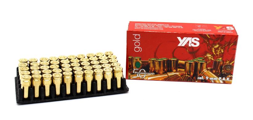 Патрон холостой светозвуковой YAS (Kaiser) кал. 9мм P.A.K. (GOLD blank), пачка 50 шт