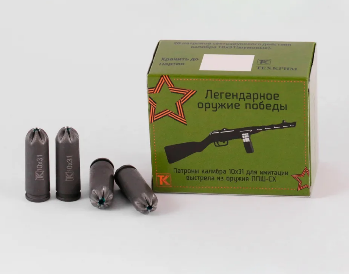 В нашем магазине вы можете купить шумовые холостые патроны светозвукового действия калибра 10х31 для ППШ-СХ, ППС-СХ и других моделей (светозвуковые, светошумовые) Патроны бывают 2х видов: патрон 10х31 для ТТ (и пистолетов) и патрон 10х31 для ППШ. Различаются навеской пороха. Для пистолетов рекомендуется брать версию для ТТ (отдельная позиция в каталоге). Производство "Техкрим" (Ижевск). В коробке 20 шт Действует акция на патроны 10х31! Чем больше патронов в заказе - тем ниже цена! Количество выбирается в окошке справа от цены. 20 шт - по 36 руб = 720 руб 100 шт - по 35 руб = 3 500 руб (пачка = 700 руб) 300 шт - по 34 руб = 10 200 руб (пачка = 680 руб) 600 шт - по 33 руб = 19 800 руб (пачка = 660 руб) Патрон холостой 10х31 ППШ Техкрим светозвуковой не является боеприпасом на основании закона "Об оружии" 150-ФЗ и может приобретаться гражданами с 18 лет. Для Екатеринбурга: