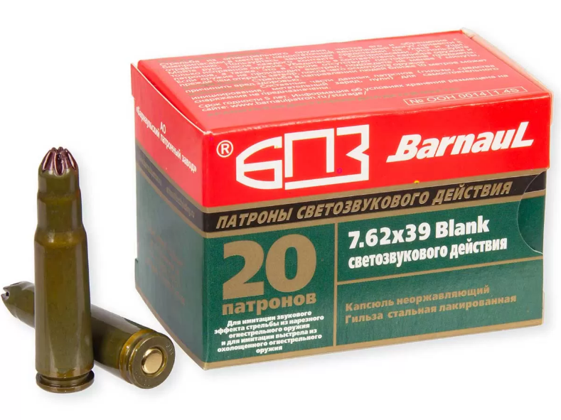 В нашем магазине вы можете купить шумовые холостые патроны 7,62х39 (светозвуковые, светошумовые) для Калашникова АК-СХП Производство "БПЗ" (Баранаульский патронный завод). Цена указана за пачку, в пачке 20 шт. В коробке 25 пачек (=500 патронов) Патрон холостой 7,62х39 светозвуковой не является боеприпасом на основании закона "Об оружии" 150-ФЗ и может приобретаться гражданами с 18 лет. . . . . . . . . . . . . . . Для Екатеринбурга: