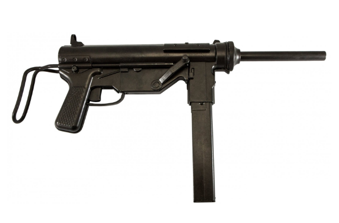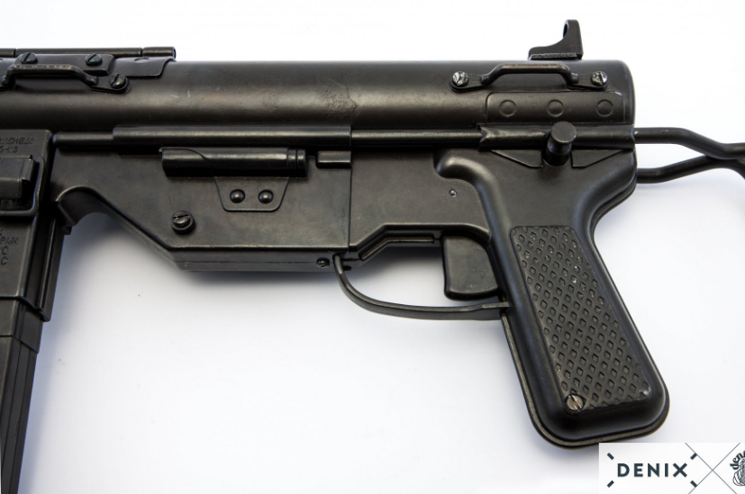 ММГ макет пистолет-пулемет M3 «Grease gun», .45 калибра (США, 1942 г, 2-я Мировая война) DENIX DE-1313 – это полноценная по размеру копия распространенного пистолета-пулемета времен 2-ой Мировой, разработка испанской компании Деникс. Изделие – полная копия боевого оружия под патроны 45 калибра. Макет имеет следующие подвижные элементы: выдвижной приклад, крышка экстрактора, предохранитель, а также магазин съемного типа. Модель имитирует механизм заряжания и стрельбы. У приклада есть два положения. Свое название автомат получил из-за своего внешнего сходства с масленкой. Автомат Гриз ган от Деникс изготовлен полностью из металлического сплава, отличается хорошей сбалансированностью и достойным качеством изготовления и сборки. Длина оружия 59 см (с максимально выдвинутым прикладом), вес – 3,15 кг Для Екатеринбурга: