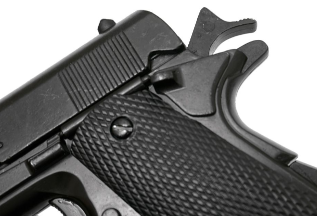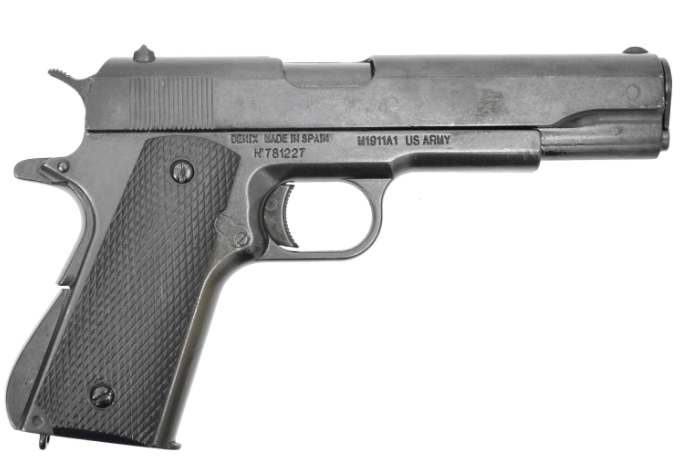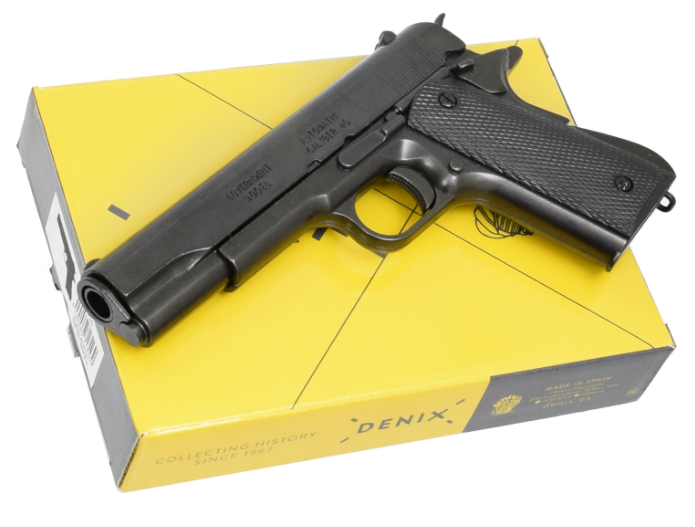 ММГ макет пистолета Colt M1911A1, .45 калибра, пластиковые накладки (США, 1911 г) DENIX DE-1316 – это изделие на базе прославленного Кольт М1911, самого известного оружия двух мировых войн и множества военных конфликтов. Изделие выполнено испанским производителем, и отличается достойным качеством исполнения и аутентичностью внешнего вида. Конструкция макета позволяет имитировать движение затвора, взвод курка и спуск (выстрел) Магазин здесь НЕсъемный (цельный корпус), предохранитель НЕ двигается. Обращаем ваше внимание, что это именно МАКЕТ оружия. Он имеет подвижные части, но НЕ МОЖЕТ СТРЕЛЯТЬ никакими снарядами и патронами. Изделие выполнено из качественного сплава металла, цвет корпуса и рукоятки черный. Пластиковые накладки на рукоятке имеют рифление, что способствует удобному удержанию пистолета.
