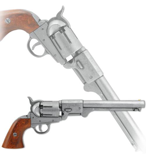 Револьвер ВМФ США, 1851 год. Представленная копия, револьвер ВМФ США, выполнена с подвижным вращающимся цилиндром-барабаном с шестью каморами в которых находятся патроны, и ударно-спусковым механизмом. Выполнен пистолет из металла с деревянными накладками на рукояти. Модель предполагалась для вооружения офицеров Военно-морского флота Северо-американских Соединённых Штатов. Это была по сути уменьшенная версия «драгунского кольта». На подобных револьверах можно было встретить гравировку в морской тематике. Что интересно, флотский кольт не обладал мушкой, мол на море и на корабле целиться не надо. Флотский кольт относительно легче и меньше, хотя все равно обладал значительными размерами. Визуально отличить флотский кольт от драгунского тяжело. Стрелял пулями 44-го калибра. Один из самых популярных револьверов Кольта в 50-х годах. Как и все револьверы Кольта, довольно-таки легко разбирался, и при необходимости можно было взять недостающую деталь с другого кольта. Однако у него был один недостаток — крайняя ненадёжность. При регулярном использовании крепления барабана начинали разбалтываться, и стрелку приходилось придерживать его левой рукой при выстреле, дабы избежать выхода пороховых газов наружу, чтобы не травмировать этим руку. И, поняв свою ошибку, Кольт стал продавать отдельные револьверные барабаны, которые можно было свободно приобрести. Револьвер имел огромную популярность не только среди военнослужащих на море, но и среди гражданских лиц на суше. Обращаем ваше внимание, что это именно МАКЕТ оружия. Он имеет подвижные части, но НЕ МОЖЕТ СТРЕЛЯТЬ никакими снарядами и патронами. Характеристики: