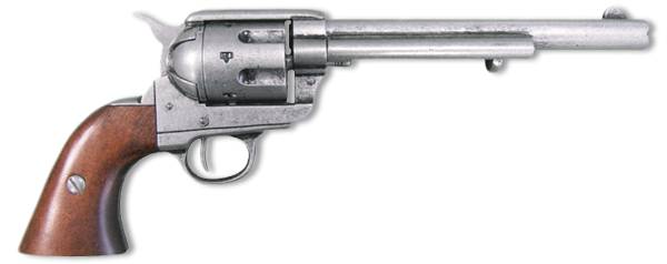 Модель 1873 года, производился на заводах Сэмюэля Кольта, позднее — компанией Colt’s Manufacturing Company. У этого револьвера есть несколько названий: The Single Action Army revolver, кольт 1873, «Миротворец». Это оружие считается символом «Дикого Запада». Модель 1873 года была специально разработана для американского правительства и принята в качестве стандартного вооружения для военных до 1892 года. Внешний вид оставался неизменным с 1873 года. Компания Colt прекращала его производство два раза, но возобновляла в связи с большим спросом и производит до сих пор. Шестизарядный кольт с ручным взводом курка, ударно-спусковой механизм одинарного действия, хотя из него можно было стрелять довольно таки скорострельно, взводя курок левой рукой. Несмотря на наличие шести камор, пистолет обычно заряжался пятью патронами — камора напротив ствола оставлялась пустой во избежание непроизвольного выстрела оружия. Выпускался под патроны более чем 30 калибров, от 0.22 до 0.45, с различной длиной ствола. Оснащён боковым стержневым эжектором. Отдельные стрелки носили его при себе в двух экземплярах. Перезарядка осуществлялась очень просто и со скоростью, на которую способен сам стрелок — курок ставился на полувзвод, открывалась дверка барабана, с помощью бокового эжектора патрон извлекался из барабана, затем поворачивался сам барабан и так 6 раз. В конце надо было закрыть дверку барабана, либо взвести курок на боевое положение или поставить на предохранитель. Пистолет был популярен среди владельцев ранчо, шерифов и бандитов, но современные модели в основном покупают коллекционеры и актёры кино. Его дизайн оказала влияние на производство многих других моделей таких компаний the Great Western Arms Companies. Обращаем ваше внимание, что это именно МАКЕТ оружия. Он имеет подвижные части, но НЕ МОЖЕТ СТРЕЛЯТЬ никакими снарядами и патронами. Характеристики: