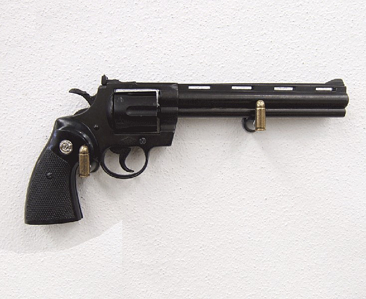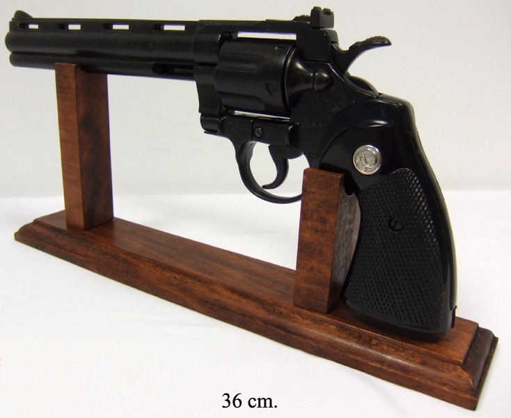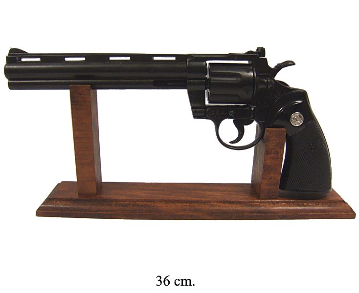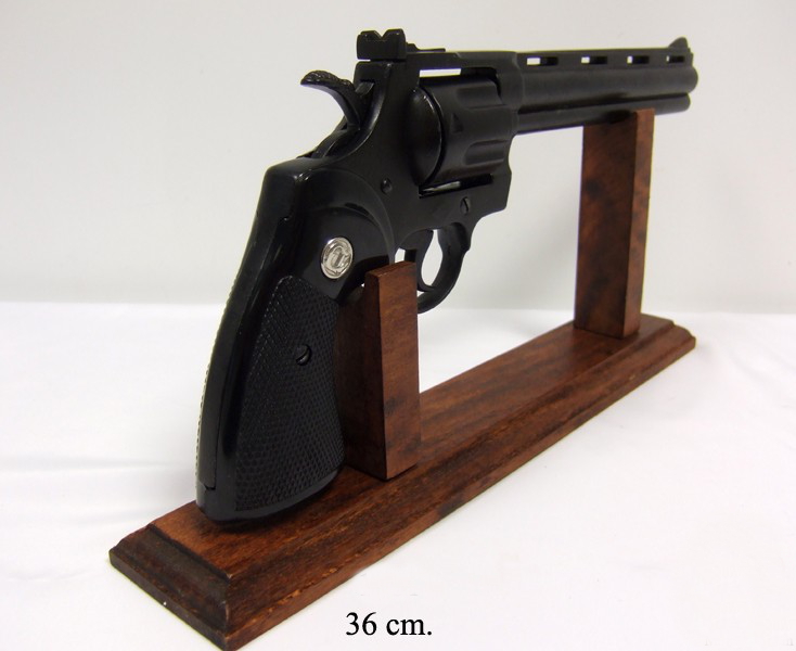 Револьвер Python, калибр 357 Magnum (магнум), США 1955 год, 8-дюймовый. Представленная копия, револьвер магнум, выполнена с подвижным (откидывающимся, вращающимся) цилиндром-барабаном с шестью каморами под патроны, и ударно-спусковым механизмом. Курок взводится, спуск щелкает. Выполнен пистолет револьвер магнум из металла с пластиковыми накладками на рукояти. Обращаем ваше внимание, что это именно МАКЕТ оружия. Он имеет подвижные части, но НЕ МОЖЕТ СТРЕЛЯТЬ никакими снарядами и патронами. Характеристики: