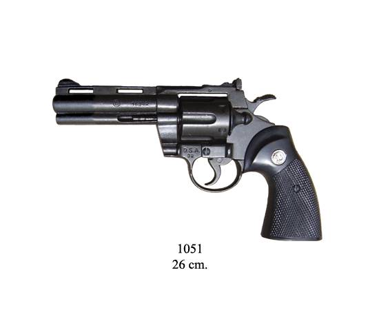 Револьвер Python, калибр 357 Magnum (магнум), США 1955 г., 4-х дюймовый. Представленная копия, револьвер магнум, выполнена с подвижным (откидывающимся, вращающимся) цилиндром-барабаном с шестью каморами под патроны, и ударно-спусковым механизмом. Курок взводится, спуск щелкает. Выполнен пистолет револьвер магнум из металла с пластиковыми накладками на рукояти. Обращаем ваше внимание, что это именно МАКЕТ оружия. Он имеет подвижные части, но НЕ МОЖЕТ СТРЕЛЯТЬ никакими снарядами и патронами. Характеристики: