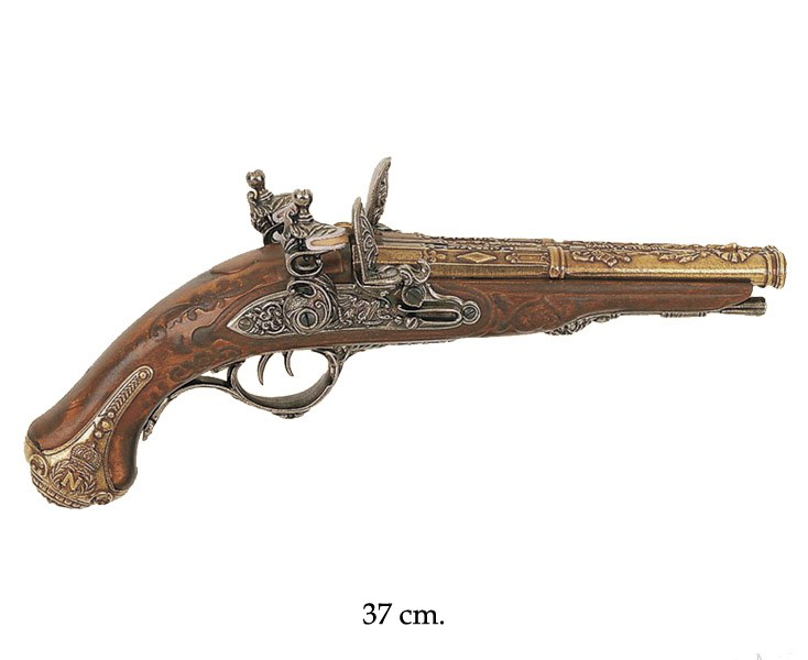 Пистоль двуствольный с ударно-кремнёвым замком, изготовленный для Наполеона в 1806 году. Представляем образец (точную копию) огнестрельного оружия войны 1812 года (Россия), изготовленного для Наполеона в 1806 году. Испанская фабрика производит копии (размер, вес) огнестрельного оружия войны 1812 года с полной имитацией кремневого ударно-спускового механизма Обращаем ваше внимание, что это именно МАКЕТ оружия. Он имеет подвижные части, но НЕ МОЖЕТ СТРЕЛЯТЬ никакими снарядами и патронами. Характеристики: