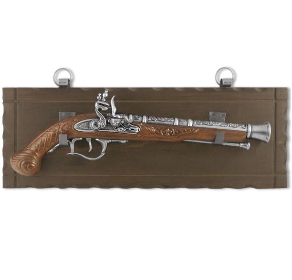Пистоль является полноразмерной копией (вес, размер) оригинала. Представленная копия, пистоль оружие, изготовлена с подвижным ударно кремнёвым замком. Ствол старинного пистолета выполнен из металла, с колодкой и рукоятью из пластика на панно из дерева (массив). Обращаем ваше внимание, что это именно МАКЕТ оружия. Он имеет подвижные части, но НЕ МОЖЕТ СТРЕЛЯТЬ никакими снарядами и патронами. Характеристики: