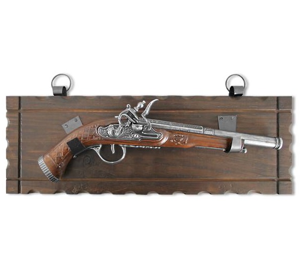 Пистоль является полноразмерной копией (вес, размер) оригинала. Представленная копия, пистоль оружие, изготовлена с подвижным ударно кремнёвым замком. Ствол старинного пистолета выполнен из металла, с колодкой и рукоятью из пластика на панно из дерева (массив). Обращаем ваше внимание, что это именно МАКЕТ оружия. Он имеет подвижные части, но НЕ МОЖЕТ СТРЕЛЯТЬ никакими снарядами и патронами. Характеристики: