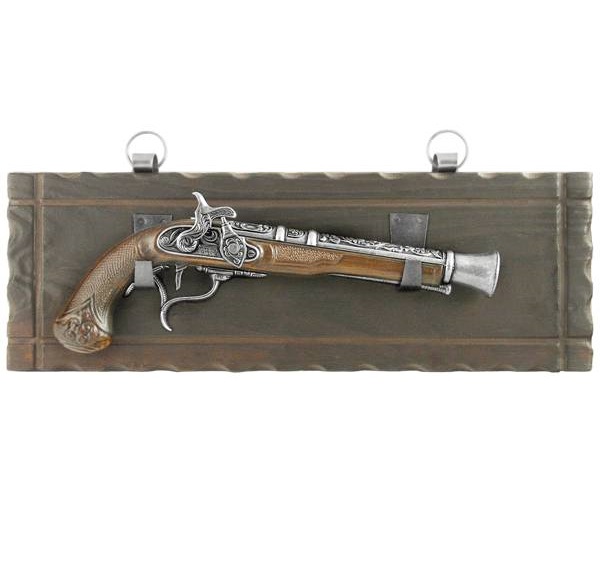Пистоль является полноразмерной копией (вес, размер) оригинала. Представленная копия, пистоль оружие, изготовлена с подвижным ударно кремнёвым замком. Ствол старинного пистолета выполнен из металла, с колодкой и рукоятью из пластика на панно из дерева (массив). Обращаем ваше внимание, что это именно МАКЕТ оружия. Он имеет подвижные части, но НЕ МОЖЕТ СТРЕЛЯТЬ никакими снарядами и патронами. Характеристики: