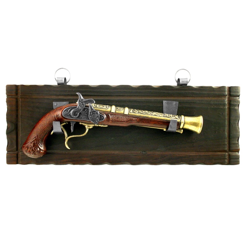 Пистоль является полноразмерной копией (вес, размер) оригинала. Представленная копия, пистоль оружие, изготовлена с подвижным ударно кремнёвым замком. Ствол старинного пистолета выполнен из металла, с колодкой и рукоятью из пластика на панно из дерева (массив). Обращаем ваше внимание, что это именно МАКЕТ оружия. Он имеет подвижные части, но НЕ МОЖЕТ СТРЕЛЯТЬ никакими снарядами и патронами. Характеристики: