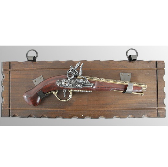 Пистоль является полноразмерной копией (вес, размер) оригинала. Представленная копия, пистоль оружие, изготовлена с подвижным ударно кремнёвым замком. Ствол старинного пистолета выполнен из металла, с колодкой и рукоятью из пластика на панно из дерева (массив). Обращаем ваше внимание, что это именно МАКЕТ оружия. Он имеет подвижные части, но НЕ МОЖЕТ СТРЕЛЯТЬ никакими снарядами и патронами. Характеристики: