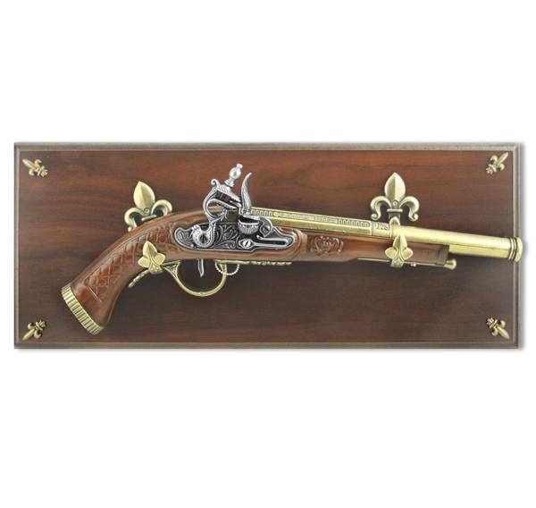 Пистоль является полноразмерной копией (вес, размер) оригинала. Представленная копия, пистоль оружие, изготовлена с подвижным ударно кремнёвым замком. Ствол старинного пистолета выполнен из металла, с колодкой и рукоятью из пластика на панно из дерева (массив). Обращаем ваше внимание, что это именно МАКЕТ оружия. Он имеет подвижные части, но НЕ МОЖЕТ СТРЕЛЯТЬ никакими снарядами и патронами. Характеристики: