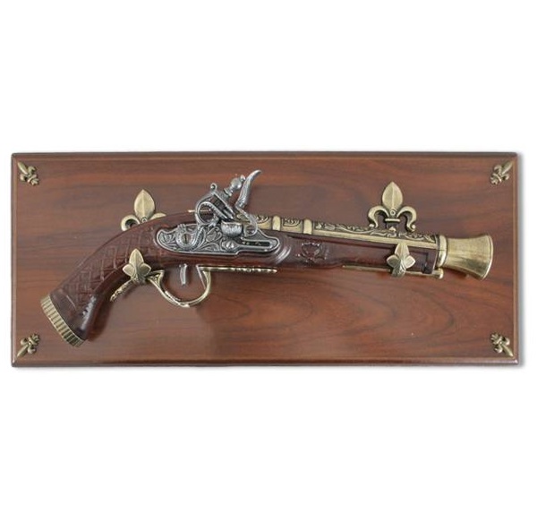 Пистоль является полноразмерной копией (вес, размер) оригинала. Представленная копия, пистоль оружие, изготовлена с подвижным ударно кремнёвым замком. Ствол старинного пистолета выполнен из металла, с колодкой и рукоятью из пластика на панно из дерева (массив). Обращаем ваше внимание, что это именно МАКЕТ оружия. Он имеет подвижные части, но НЕ МОЖЕТ СТРЕЛЯТЬ никакими снарядами и патронами. Характеристики: