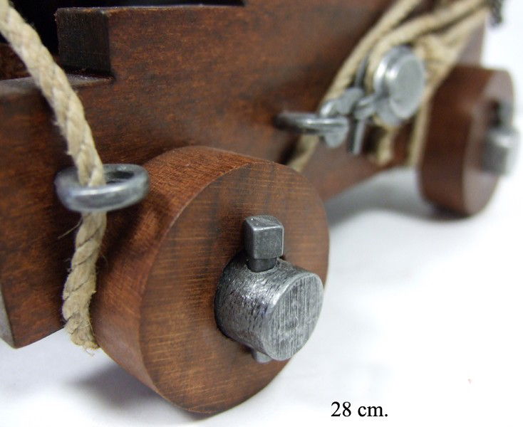 До начала использования пороха успех битвы зависел от стратегии и подготовки войска. Битва была рукопашной, солдаты сражались бесстрашно и безжалостно. С появлением огнестрельного оружия организация битвы претерпела радикальные изменения. Первым образцом огнестрельного оружия был камнемет, который появился в четырнадцатом столетии. Он состоял из кованых железных прутьев, скрепленных железными обручами. Позднее появилась примитивная пушка, которую можно было заряжать с обоих концов. Любопытным произведением оружейного мастерства того времени является орган, состоящий из нескольких десятков малокалиберных дул. До середины пятнадцатого века у орудий артиллерии отсутствовал лафет, поэтому они были не мобильны. Существовали разные размеры камнеметов. Они были настолько мощными "разрушителями стен", что их можно назвать "ядерным оружием" того времени. Для знати обладание камнеметом являлось свидетельством могущества и богатства. Камнеметы перевозили на повозках, запряженных тяжеловозами. Почти всегда их старались установить как можно ближе от стен штурмуемой крепости. Рядом устанавливали пушки поменьше и строили деревянные прикрытия для стрелков. Обращаем ваше внимание, что это именно МАКЕТ оружия. Он имеет подвижные части, но НЕ МОЖЕТ СТРЕЛЯТЬ никакими снарядами и патронами. Характеристики: