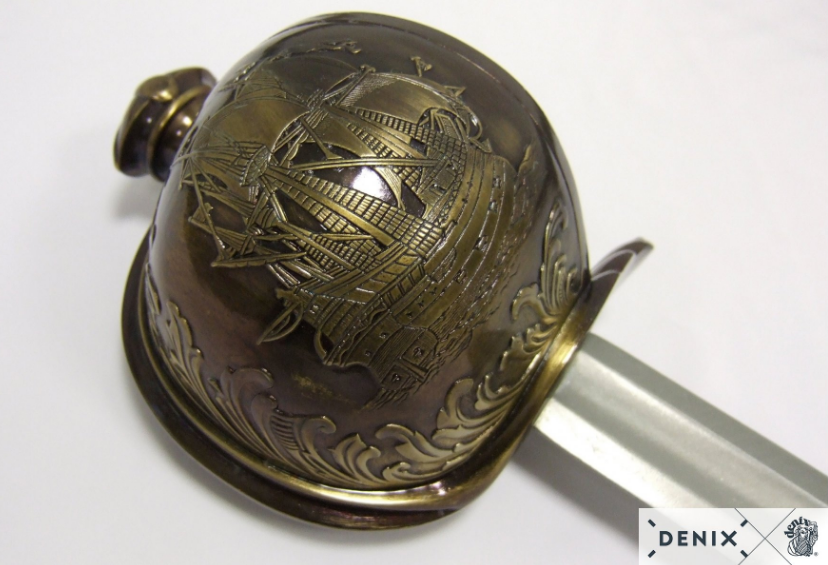 ММГ Denix сабля пирата Хайреддина Барбаросса, DE-4200: Сабля пирата Барбаросса «Красная борода», 1478-1546 (Турция, XVI век) DE-4200 – это эффектное изделие от Деникс на основе колющего оружия, распространенного, в том числе и среди морских разбойников. Вполне возможно, что именно такой саблей владел знаменитый Хайреддин Барбаросса, прозванный Красной бородой. Этот знаменитый пират наводил ужас на корабли европейских стран, проходящих по Средиземному морю. Внешний вид сабли великолепен, и в точности копирует дошедшие до нас сабли того времени. Клинок лишен заточки, что делает изделие безопасным и позволяет использовать его в качестве интерьерного элемента. Сабля имеет небольшие габаритные размеры, это связано с ее использованием в пределах пространства корабля при абордаже. Основной материал – металл. Клинок имеет своеобразную конфигурацию, он небольшой длины и расширен к концу. На поверхности клинка изображен морской дракон. Эфес имеет округлую форму гарды (ее иногда называют корзиной), она защищает руку владельца от ударов противника. Поверхность гарды украшена изображением морского корабля под парусами. Длина сабли 81,5 см, вес 1,51 кг. Сабля Барбаросса от Деникс – отличный подарок ценителям красивых вещей и коллекционерам холодного оружия, может использоваться для косплея и тематических фотосъемок. Для Екатеринбурга: