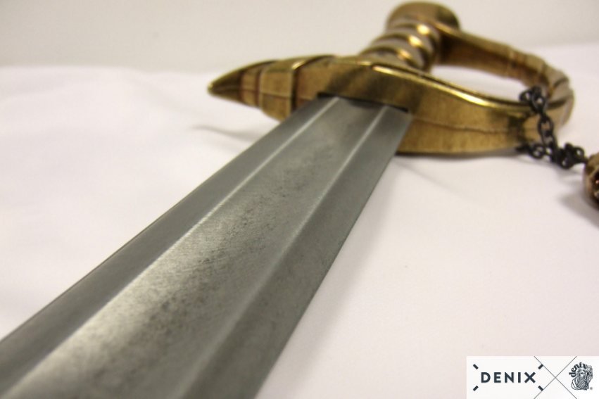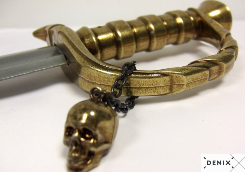ММГ Denix макет Сабля пирата Эдварда Тича «Черная борода», 1680-1718 (Англия, 18 век), DE-4197 Сабля пирата Эдварда Тича «Черная борода», 1680-1718 (Англия, XVIII век) DE-4197 – это красивое изделие декоративного назначения, изготовленное брендом Деникс как копия холодного оружия знаменитого пирата. Сабля отличается весьма презентабельным внешним видом, и, возможно, именно с таким оружием выходил на морские просторы грозный пират Черная Борода. В любом случае, изделие выполнено как абордажная сабля, и внешне неотличимо от настоящего оружия. Клинок сабли небольшой длины, слегка изогнут, а к концу расширен. Такая сабля была идеальна в бою в условиях ограниченного пространства морского судна, отлично подходила для рубки канатов и деревянных элементов корабля. Основной материал изделия – сплав с металлом. Цвет клинка серебристый, на нем присутствует изображение морского дракона. Эфес изделия выполнен в золотистом цвете, для удобства хвата поверхность рукоятки имеет подобие ребер. Гарда сабли декоративная, на ней висит брелок в форме черепа. Вес изделия 1,42 кг, общая длина 81 см. Сабля пирата Черная борода – отличный презент любителю холодного оружия, изделие пополнит коллекцию и может использоваться для фотосессий, тематических вечеринок или как интерьерное украшение. Для Екатеринбурга: