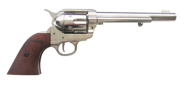 Револьвер 45 калибра кавалерийский Модель 1873 года, производился на заводах Сэмюэля Кольта, позднее — компанией Colt’s Manufacturing Company. Внешний вид оставался неизменным с 1873 года. Компания Colt прекращала его производство два раза, но возобновляла в связи с большим спросом и производит до сих пор. Шестизарядный кольт с ручным взводом курка, ударно-спусковой механизм одинарного действия, хотя из него можно было стрелять довольно таки скорострельно, взводя курок левой рукой. Несмотря на наличие шести камор, пистолет обычно заряжался пятью патронами — камора напротив ствола оставлялась пустой во избежание непроизвольного выстрела оружия. Выпускался под патроны более чем 30 калибров, от 0.22 до 0.45, с различной длиной ствола. Оснащён боковым стержневым эжектором. Отдельные стрелки носили его при себе в двух экземплярах. Перезарядка осуществлялась очень просто и со скоростью, на которую способен сам стрелок — курок ставился на полувзвод, открывалась дверка барабана, с помощью бокового эжектора патрон извлекался из барабана, затем поворачивался сам барабан и так 6 раз. В конце надо было закрыть дверку барабана, либо взвести курок на боевое положение или поставить на предохранитель. Пистолет был популярен среди владельцев ранчо, шерифов и бандитов, но современные модели в основном покупают коллекционеры и актёры кино. Его дизайн оказал влияние на производство многих других моделей таких компаний the Great Western Arms Companies. Обращаем ваше внимание, что это именно МАКЕТ оружия. Он имеет подвижные части, но НЕ МОЖЕТ СТРЕЛЯТЬ никакими снарядами и патронами. Характеристики: