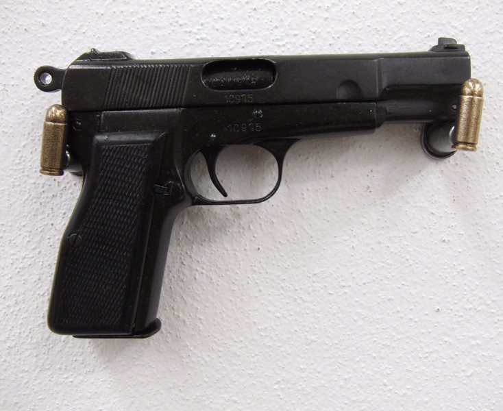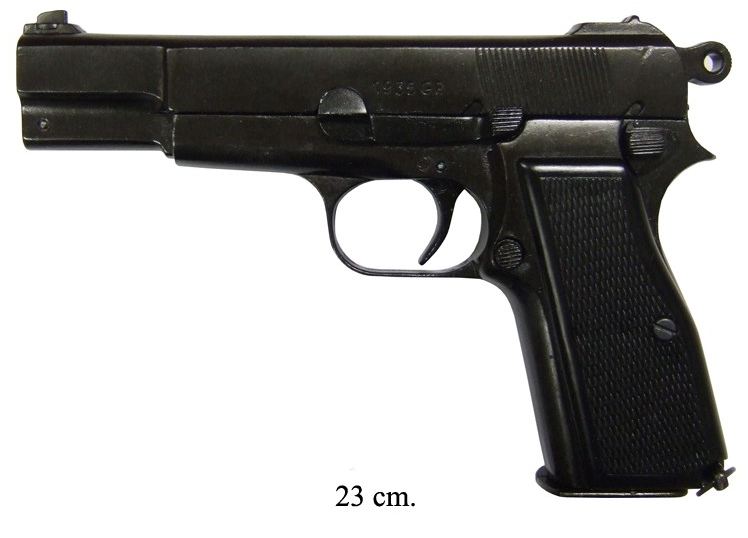 Пистолет Browning HP (High Power 1935) выпускается бельгийской фирмой ФН Эрсталь с 1935 года. Пистолет базируется на разработанной Дж. М.Браунингом в 1926 году схеме запирания со сцепленным затвором и коротким ходом ствола, позже модифицированной бельгийским конструктором Дидье Сэвом. Смерть помешала Дж. Браунингу лично передать в производство модель своего бесспорно лучшего пистолета. В начале 30-х гг. XX в. это оружие, после некоторой доработки, все же начали выпускать в Бельгии на заводах фирмы «Фабрик Насьональ» под названием «Браунинг обр. 1935 г.». Позже этот 9-мм пистолет получил собственное имя «Хай Пауэр» и был принят на вооружение армии Бельгии. На основе данного пистолета фирмой ФН создан пистолет HP DA, отличающийся УСМ двойного действия. Браунинг Хай Пауэр заслуженно считается одним из лучших пистолетов ХХ века, наравне с другим творением Джона Браунинга – Кольтом М1911. Обращаем ваше внимание, что это именно МАКЕТ оружия. Он имеет подвижные части, но НЕ МОЖЕТ СТРЕЛЯТЬ никакими снарядами и патронами. Характеристики: