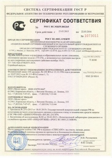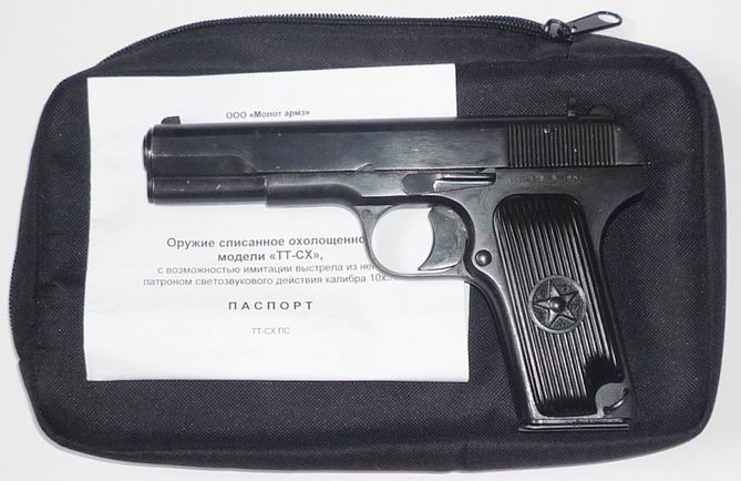 В нашем магазине вы можете купить пистолет ТТ-СХ (СХП) охолощенный (тульский токарева от Молот Армз) шумовой под светозвуковой холостой патрон 10х31 Охолощенный ТТ-СХ сделан из настоящего боевого пистолета! Автоматика затвора работает как на боевом экземпляре. Громкость выстрела как у боевого. Отличный шумовой пистолет! Посмотреть его в действии можно на видео. Вкладка "видео" выше, справа от вкладки "описание" Изготовитель ТТ-СХ "Молот армс" (г. Вятские Поляны). Сертифицирован в РФ, в свободном обороте без лицензий и разрешений. В каждую основную часть изделия "ТТ-СХ" внесены необратимые технические изменения, исключающие возможность выстрела из него боевым патроном или с использованием его основных частей: - в затворе убраны боевые упоры, вварен штифт для исключения возможности извлечения ствола; - патронник переделан под патрон светозвукового действия калибра 10х31; - в канале ствола вварены штифты. Пистолет ТТ-СХ хороший образец для реконструкторов, а также вариант для кино и театральных постановок, где необходимо имитировать выстрелы. Данный пистолет, как обозначено в паспорте, можно также использовать в культурно-просветительских целях и для военно-патриотического воспитания молодежи. Также пистолет можно применять в качестве учебного пособия, и для тренировок при обращении с пистолетами. В комплекте: изделие модели "ТТ-СХ", магазин, сумка для хранения и ношения, паспорт, сертификат Для Екатеринбурга: