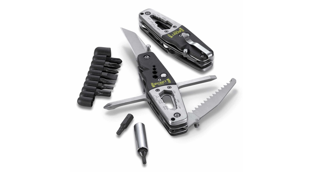 Над конструкцией многоцелевого инструмента трудились два американских дизайнера Ed Van Hoy и Tom Stokes. Инструмент позиционируется компанией как компактный карманный мультитул с большим набором функций для повседневного использования преимущественно в городских условиях, в особенности для электромонтажных работ. В комплект поставки, кроме самого 10 см инструмента, входит набор из девяти бит и держатель к ним, специальный чёрный чехол из плотного нейлона, а также инструкция пользователя и небольшой каталог продукции CRKT. Конструкция 140 граммового мультитула предусматривает большой набор различных инструментов, среди которых дюймовые и метрические наборы гаечных ключей 11-5 мм, две открывалки для бутылок, отверстия для зачистки проводов, выкидные отвёртки с прямым и крестообразным шлицем, а также пила и небольшой нож. Функциональность расширена набором из девяти бит и держателя к ним, держатель удобно фиксируется поверх крестообразной отвёртки. С обеих сторон инструмента имеются небольшие отверстия под темляк и страховочный шнур. Изготовлен преимущественно из нержавеющей стали 2CR13, с внешней стороны дополняется полностью чёрными накладками из нейлона усиленного стекловолокном. Клинок ножа выполнен из китайской хром-молибден-ванадиевой нержавеющей стали марки 5Cr15MoV, производителем заявлена твёрдость в пределах 55-56 HRC. Полная длина клинка чуть более 57 мм, длина режущей кромки 54 мм, максимальная толщина на обухе около 2.5 мм. Подружейные выкидные отвёртки, пила и нож фиксируются замками типа Liner-lock. Инструменты зафиксированы плотно, я бы даже сказал чрезмерно плотно, это относится к пиле, которую извлечь одной рукой, без послабления осевого болта, весьма трудно. Клинок пилы и ножа достаются за счёт стальных шпеньков, отвёртки, в свою очередь, быстро извлекаются нажатием подпружиненной металлической кнопки. Для Екатеринбурга: