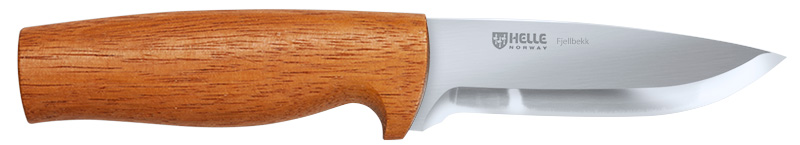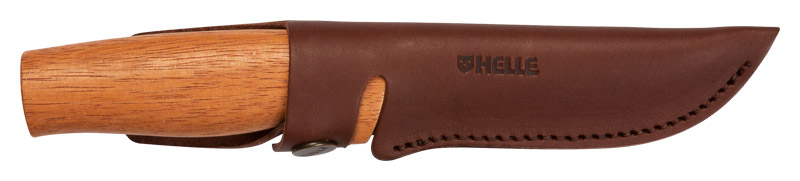 Ножны из коричневой кожи, снабженные ремешком для фиксации ножа в ножнах. С обратной стороны ножен прикреплена петля для ремня. С логотипом «Helle». Специальный выступ на рукояти обеспечивает максимально удобный и надежный хват ножа.