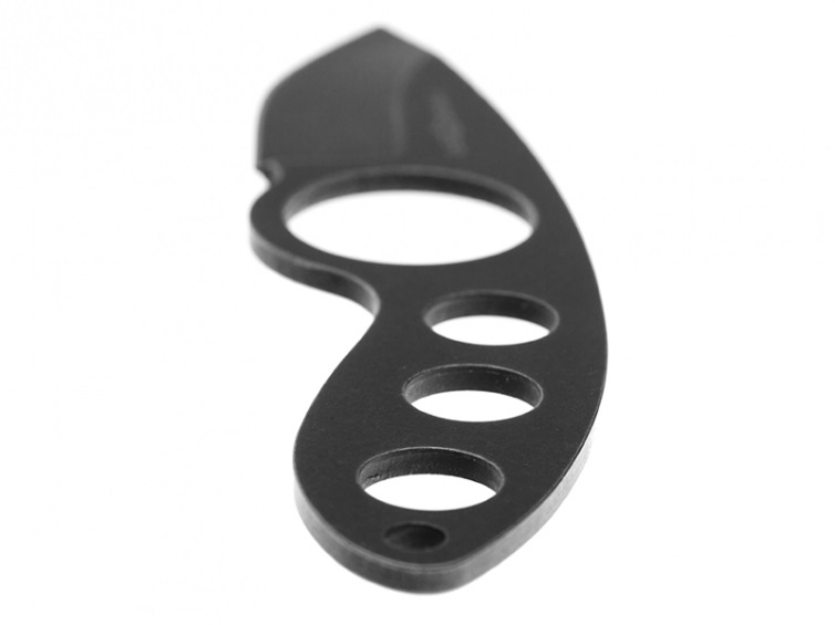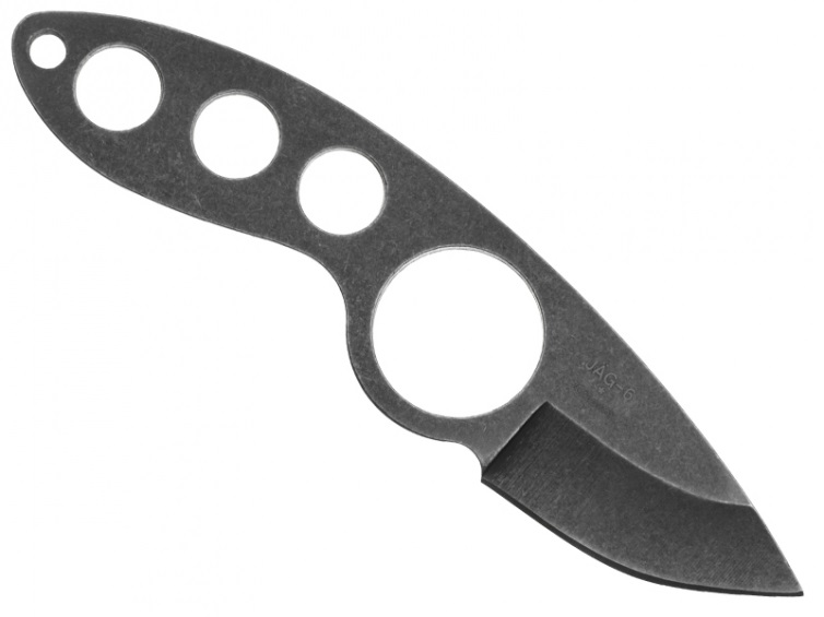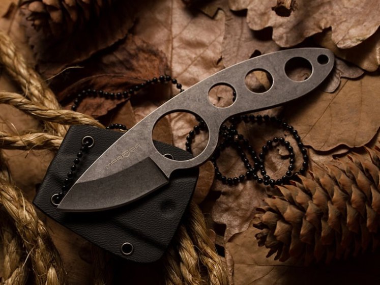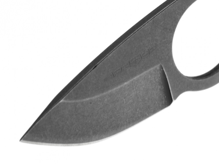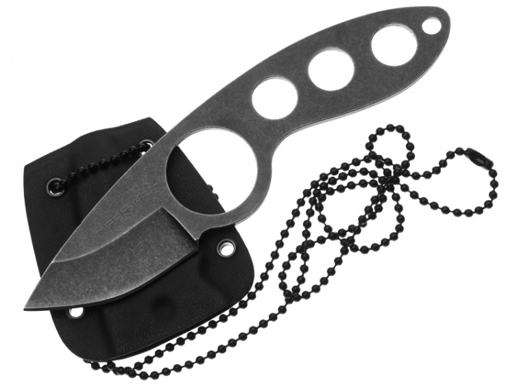 Небольшой вспомогательный шейный нож. Клинок с рукоятью представляет собой единое целое. С помощью специального отверстия нож удобно извлекается из ножен. Ножны выполнены из кайдекса.