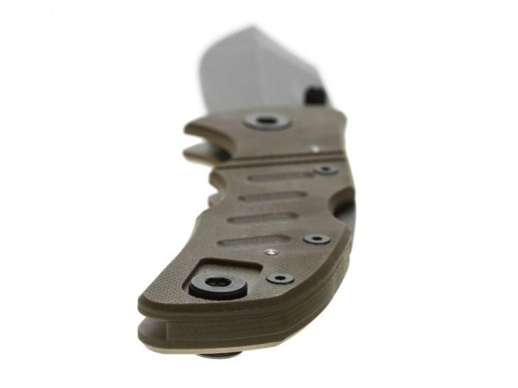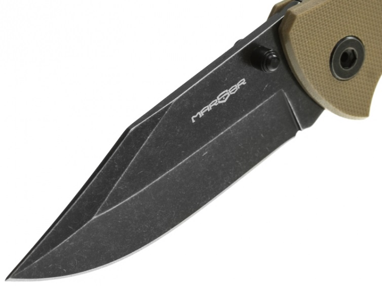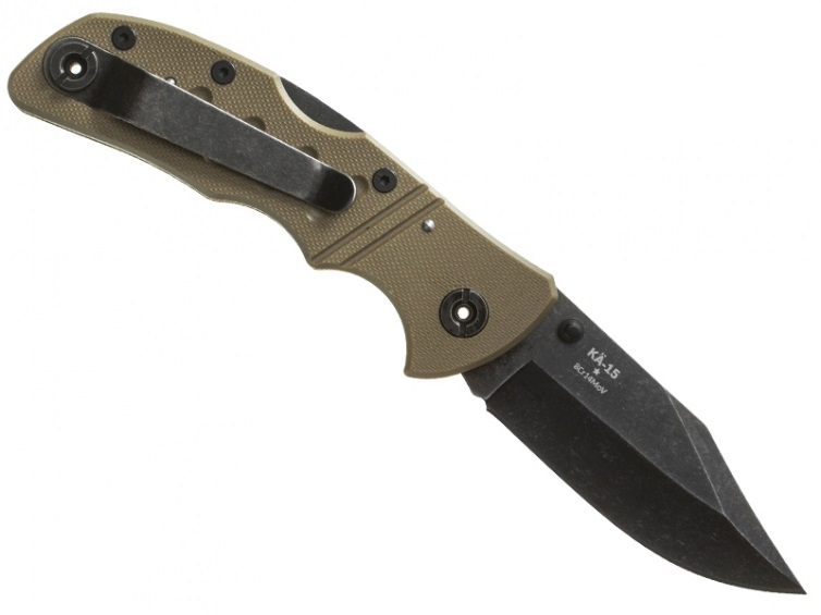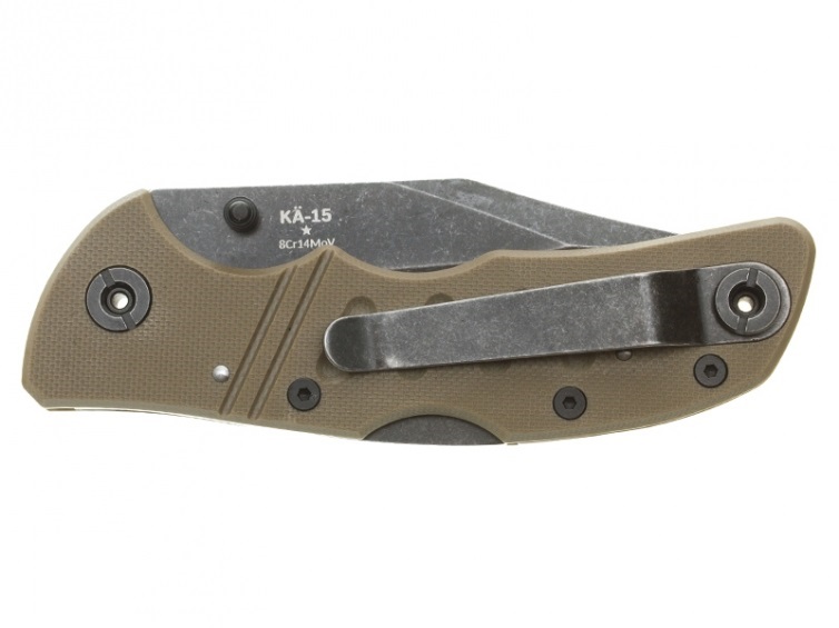 Модификация ножа Ka-14 с широким клинком типа clip point и более «цепкой» текстурой накладок G10. Обработка клинка black stonewash не бликует и защищает клинок от мелких повреждений. Технические характеристики