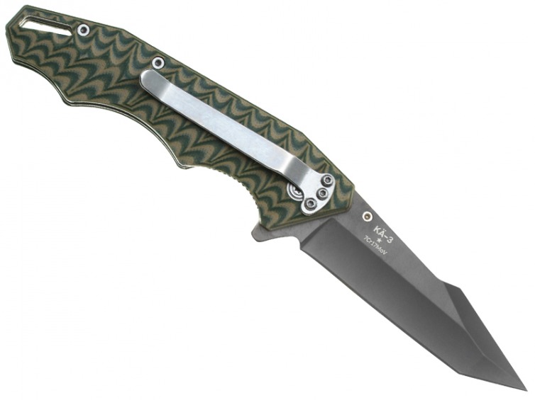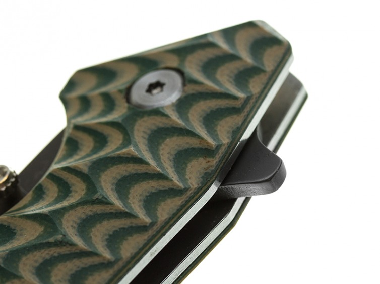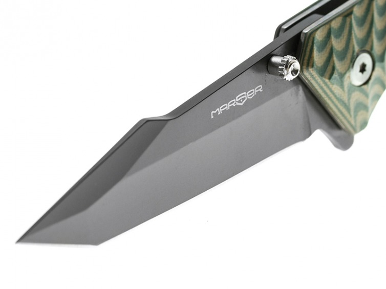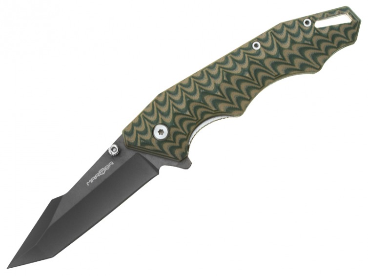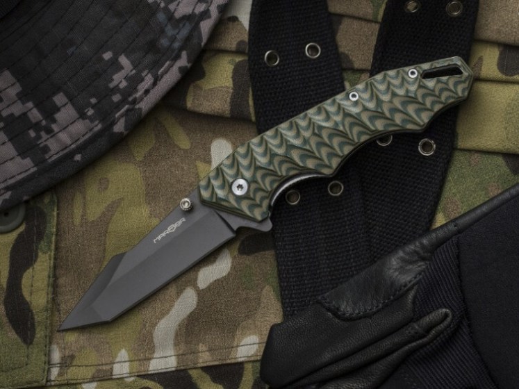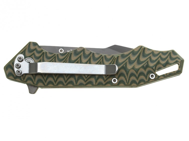 Складной нож с агрессивными чертами в дизайне. Интересный клинок типа Tanto с фальшлезвием великолепно дополняется рукоятью из G10 защитного цвета. Оригинальная текстура рукояти не только придает ножу уникальный облик, но и обеспечивает цепкость при удержании ножа. Характеристики: