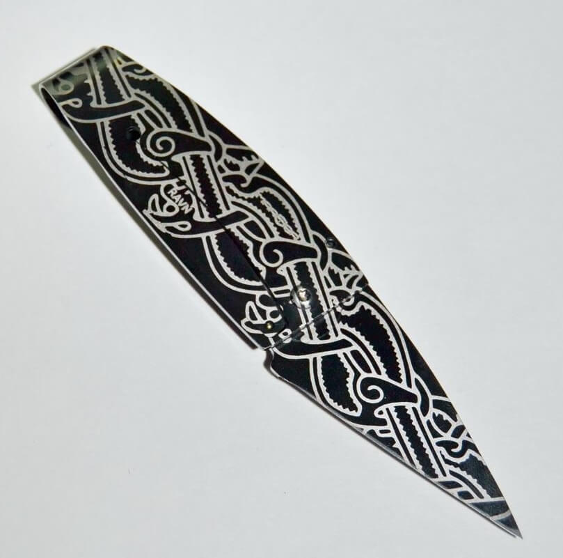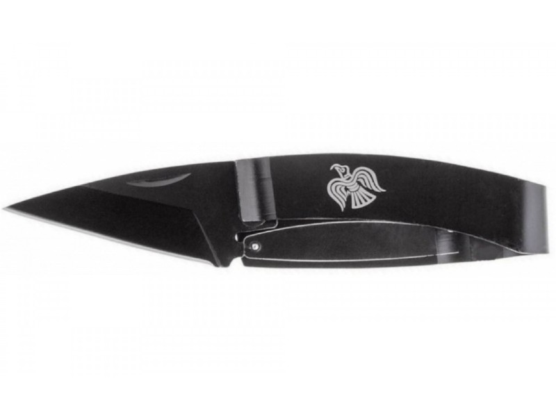Средневековые короли и князья часто украшали свои знамена и штандарты изображением ворона (Ravn). Два ворона, Хугин и Мунин, приносили своему повелителю Одину известия со всего света. Сидя на плечах Одина, они нашептывали ему новости и мудрые советы. Marser Ravn – это нож-клипса для денег. Совершенно черный, с одной стороны украшен каноническим изображением ворона, с другой – германским узором. Нож эффектно смотрится, упакован в блистер в полуоткрытом виде. Характеристики: