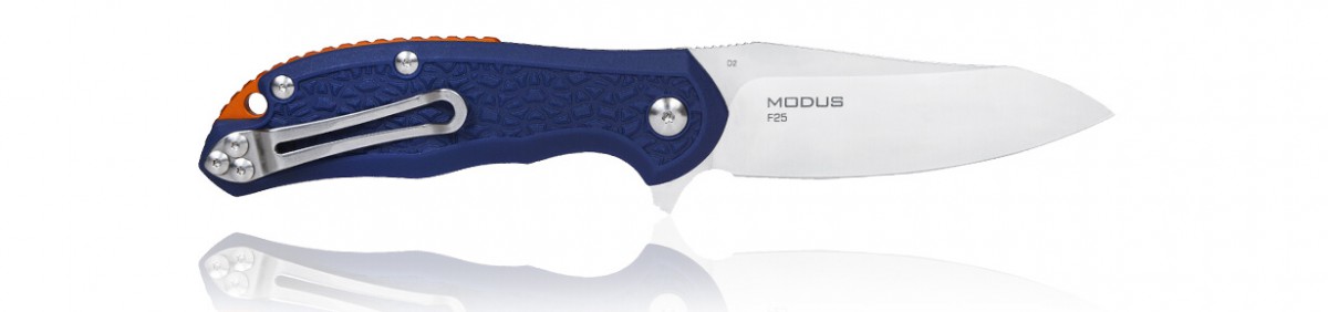 Will F25-13 Modus - очередная новинка от Steel Will. Клинок Modus F25-11 изготовлен из стали D2, зарекомендовавшей себя, как отлично сбалансированная, позволяющая клинку агрессивно резать и хорошо удерживать остроту режущей кромки. Сталь D2 относится к премиальному сегменту и используется именитыми производителями ножей по всему миру. В основе конструкции рукояти -перфорированные стальные лайнеры. Они легки и прочны. Накладки из пластика FRN текстурированы для лучшего сцепления с ладонью, а притаившийся между ними синий спейсер из анодированного алюминия служит не только яркой деталью, но и посадочным местом для темляка.