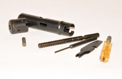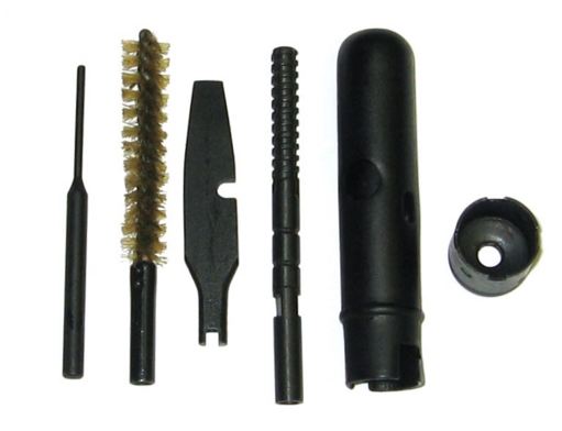 Пенал для чистки Калашникова 7.62х39 мм. В комплект входит: пенал с крышкой, протирка, ершик, отвертка и выколотка. Длина 90 мм. Вес около 80 гр. Сделано в СССР. Протирка применяется для чистки и смазки канала ствола, каналов и полостей других частей автомата или пулемета. Она имеет внутреннюю резьбу для навинчивания на шомпол и прорезь для ветоши или пакли. Ершик используется для чистки канала ствола раствором РЧС. Отвертка и выколотка применяются при разборке и сборке автомата или пулемета. Вырез на конце отвертки предназначен для ввинчивания и вывинчивания мушки, а боковой вырез — для закрепления протирки на шомполе. Для удобства пользования отверткой она вставляется в боковые отверстия пенала. При чистке канала ствола отвертка вкладывается в пенал поверх головки шомпола. Пенал служит для хранения протирки, ершика, отвертки и выколотки. Он закрывается крышкой. Пенал применяется как рукоятка для отвертки при ввинчивании и вывинчивании мушки и для поворота замыкателя газовой трубки, а также как рукоятка для шомпола. Пенал имеет сквозные отверстия, в которые вставляется шомпол при чистке автомата или пулемета, овальные отверстия для отвертки и прямоугольное отверстие для поворота замыкателя газовой трубки при разборке и сборке автомата или пулемета. Для Екатеринбурга: