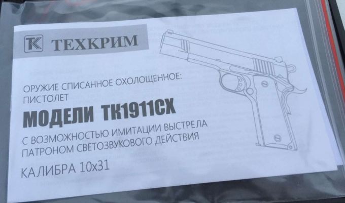 В нашем магазине вы можете купить охолощенный пистолет Кольт ТК1911СХ (пр-во Техкрим) под светозвуковой холостой патрон калибра 10х31 Настоящий американский Colt доступный БЕЗ ЛИЦЕНЗИИ! Ознакомиться с моделью можно по видео. Вкладка "видео" выше, справа от вкладки "описание" Доработка ствола: В комплекте: качественный кейс, охолощенный пистолет ТК-1911-СХ, 2 магазина к нему, шомпол и ершик для чистки, паспорт, сертификат Для Екатеринбурга: