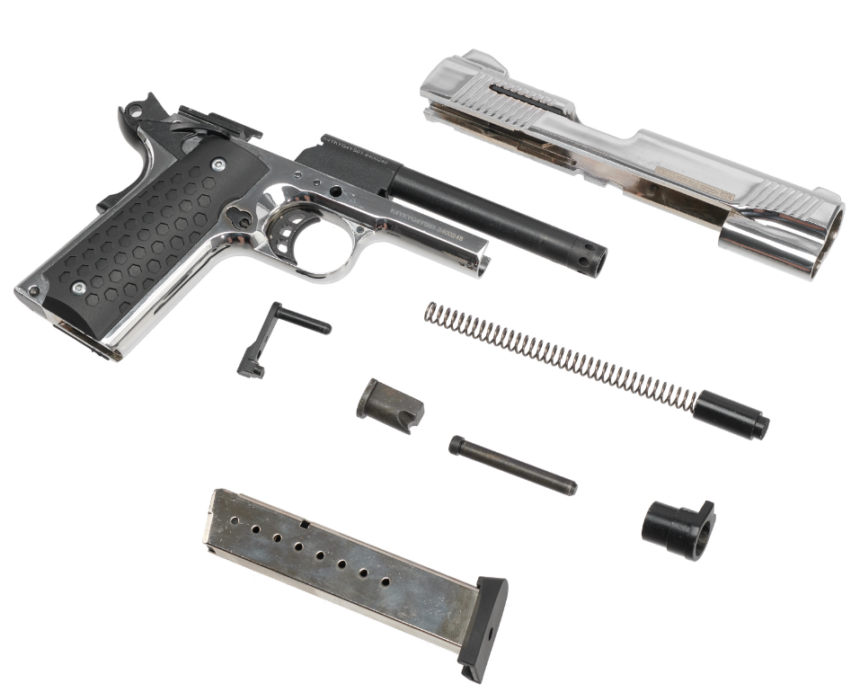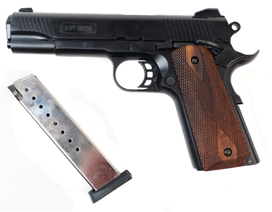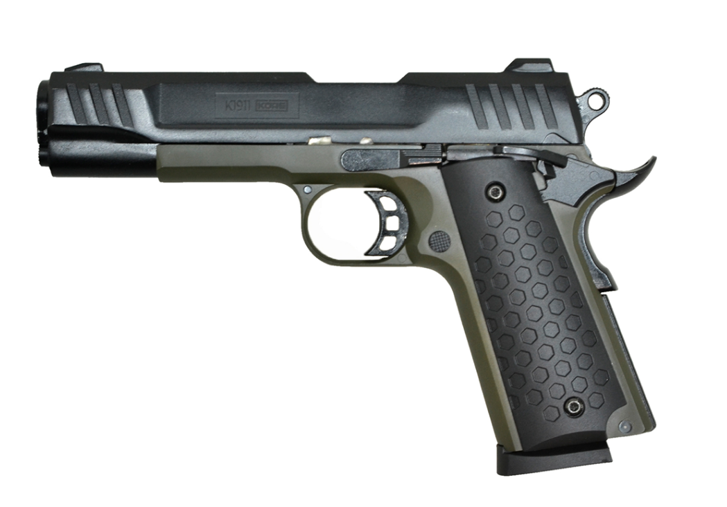 Главная → Купить по низкой цене → Охолощенное оружие → Пистолеты СХП → Пистолет охолощенный К-1911 Kurs, кал. 10ТК (чёрный, хром, хаки)