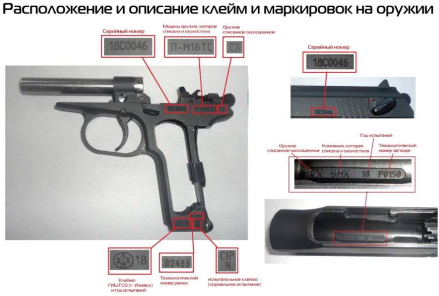 Пистолет охолощенный модели ПМ18Х – это списанное охолощенное оружие, с возможностью имитации выстрела патроном светозвукового действия калибра 10х24 от компании «Уралмехкомплект» (г. Ижевск). Пистолет изготовлен путем охолощения ОООП пистолета служебного модели П-М18ТС (травматического, с КОВАНЫМ затвором). Пистолет П-М18Х предназначен для подачи световых и звуковых сигналов. Для имитации выстрела из пистолета применяются патроны светозвукового действия калибра 10х24 (рекомендованы к использованию патроны производства ЗАО «Техкрим»). Габаритные размеры, мм - 166х127х31 Пистолет П-М18Х охолощенный находится в свободной продаже и не требует для приобретения никаких разрешений и лицензий. Конструктивные особенности Пистолет изготовлен из списанного ОООП пистолета служебного модели П-М18ТС путем его охолощения. Для обеспечения невозможности восстановления поражающих свойств, выполнены следующие доработки конструкции пистолета модели ПМ18ТС: - в канал ствола пистолета запрессованы и заварены два твердозакаленных вертикальных поперечных штифта. Один штифт расположен сразу за патронником, второй в 5 мм от дульного среза. Сам ствол выполнен неотъемным от рамки, путем приварки твердозакаленного штифта крепления ствола к рамке; - в затвор пистолета запрессован и заварен твердозакаленный штифт, исключающий его установку на не охолощённые изделия и расположенный в зоне «буртика» ствола, на «буртике» ствола выполнена лыска под вышеуказанный штифт затвора. Выбор патрона калибра 10х24 для обеспечения имитации выстрела обусловлен тем, что: - масса затвора охолощаемого пистолета П-М18ТС аналогична массе затвора пистолета ПМ и именно патрон калибра 10х24 способен обеспечить стабильную работу автоматики пистолета. Например при применении патрона калибра 10ТК пришлось бы уменьшать массу затвора как делают большинство производителей охолощенных пистолетов на базе ПМ. - сам патрон 10х24, в отличии от патрона калибра 10ТК, почти идеально вписывается в конструкцию магазина ПМ и обеспечивает стабильность работы патроноподающего механизма - геометрия пульного ската ствола охолощаемего пистолета П-М18ТС надежно, без доработки, обеспечивает подачу патронов калибра 10х24 - патрон калибра 10х24 обеспечивает сопоставимый с «боевым» характер имитации выстрела по пламенности и звуку. Для Екатеринбурга: