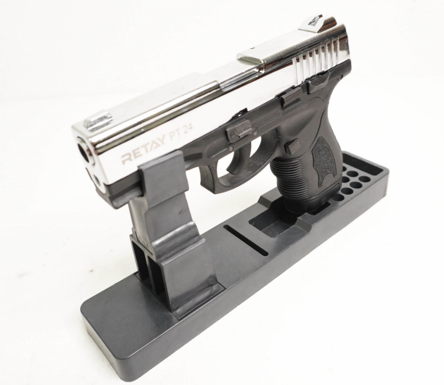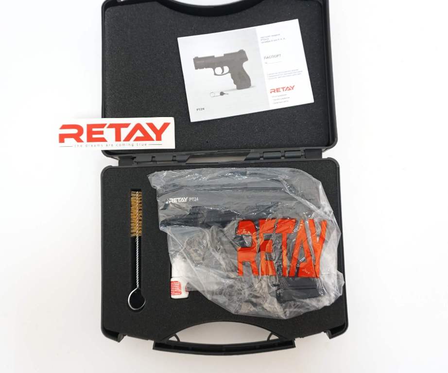 Охолощенный пистолет RETAY Taurus PT24 — это модификация для использования с холостыми патронами, по экстерьеру, массе и габаритным параметрам сопоставимая с боевым аналогом. Процесс охолощения данного экземпляра проводился компанией Retay (Турция). В качестве боеприпасов здесь применяются светозвуковые патроны 9мм P.A.K. Магазин пистолета рассчитан на 14 таких боеприпасов. С конца 2021 года данная модель стреляет только полуавтоматически (одиночными), режима стрельбы очередями НЕТ Доступные цвета (выбрать можно в окошке, справа от цены): В качестве прототипа использован бразильский пистолет Taurus PT24. Модель представлена в 2004 г., создана на основе линейки моделей Millennium, которые предназначались для обеспечения силовых структур и населения. Характеристики: