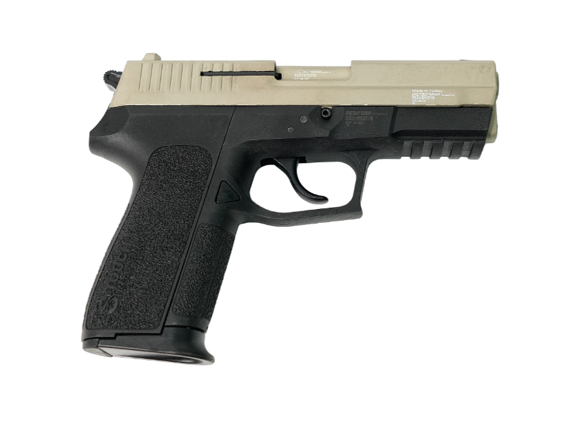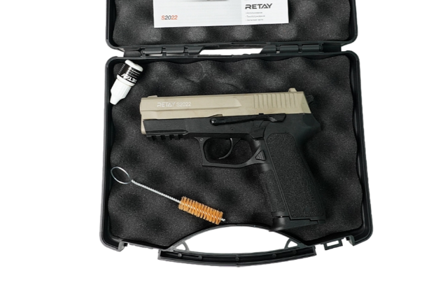 Охолощенный пистолет Retay S2022 (Sig Sauer 2022, black) порадует поклонников вышеназванных моделей. Эту копию огнестрельных пистолетов представила фирма Ретэй Армс из Турции, которая производит охолощенные, газовые, травматические и огнестрельные экземпляры оружия с 2006 года. Доступные цвета (выбрать можно в окошке, справа от цены): Пистолет SP 2022 использует полиция и жандармерия Франции с 2002 года. Это модификация самозарядного полуавтоматического пистолета из серии Sig Sauer Pro. Первое такое оружие изготовили совместно немецкая и швейцарская компании в 1998 году. Ствол оружия имеет заглушку, что и делает пистолет охолощенкой. Рама таких охолощенных пистолетов Retay S2022 (Sig Sauer 2022, black) состоит из ударопрочного полимерного материала, который отличается повышенной прочностью. Затвор этого оружия и ствол турецкий производитель изготовил из металлического сплава Zamak , также отличающегося повышенной надежностью, но при этом не добавляющего веса оружию. Вес пистолета 923 грамма. Длина Retay S2022 - 180 мм. Отсюда следует, что владелец уместит пистолет в стандартную кобуру, как плечевого, так и поясного типа.
