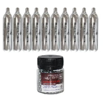 Набор включает в себя: - 10 баллонов Борнер или Кварта (СО2 12 г) - банка шариков ВВ 4,5 мм (500 шт) Для Екатеринбурга: